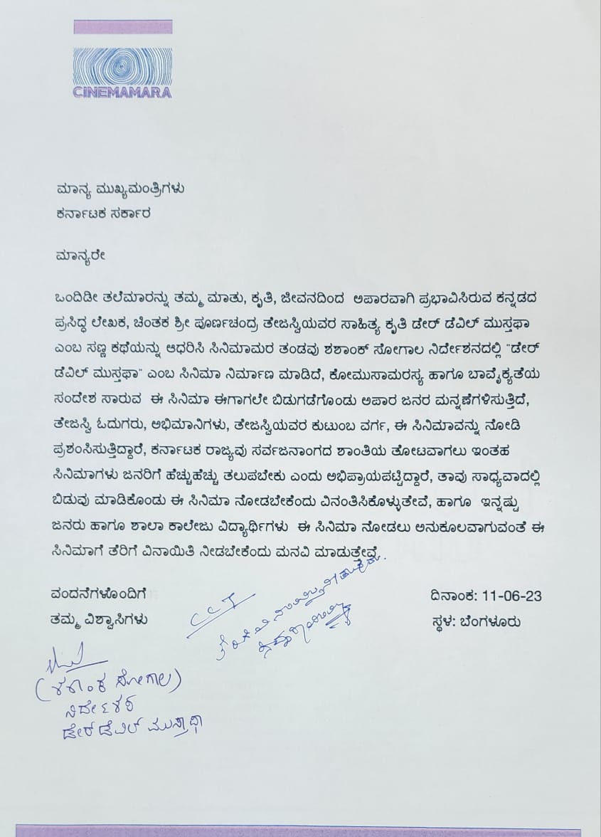 ತಮ್ಮ ಬರಹ ಮತ್ತು ಬದುಕಿನ ಮೂಲಕ ಒಂದಿಡೀ ತಲೆಮಾರಿನ ಜನರನ್ನು ಪ್ರಭಾವಿಸಿದ ಹಾಗೂ ಪ್ರಭಾವಿಸುತ್ತಲೇ ಇರುವ ಕನ್ನಡದ ಜನಪ್ರಿಯ ಸಾಹಿತಿ ಕೆ.ಪಿ. ಪೂರ್ಣಚಂದ್ರ ತೇಜಸ್ವಿಯವರ ಕತೆಯಾಧಾರಿತ "ಡೇರ್ ಡೆವಿಲ್ ಮುಸ್ತಫಾ" ಸಿನಿಮಾಗೆ ತೆರಿಗೆ ವಿನಾಯಿತಿ ನೀಡಿ ಆದೇಶಿಸಿದ್ದೇನೆ.