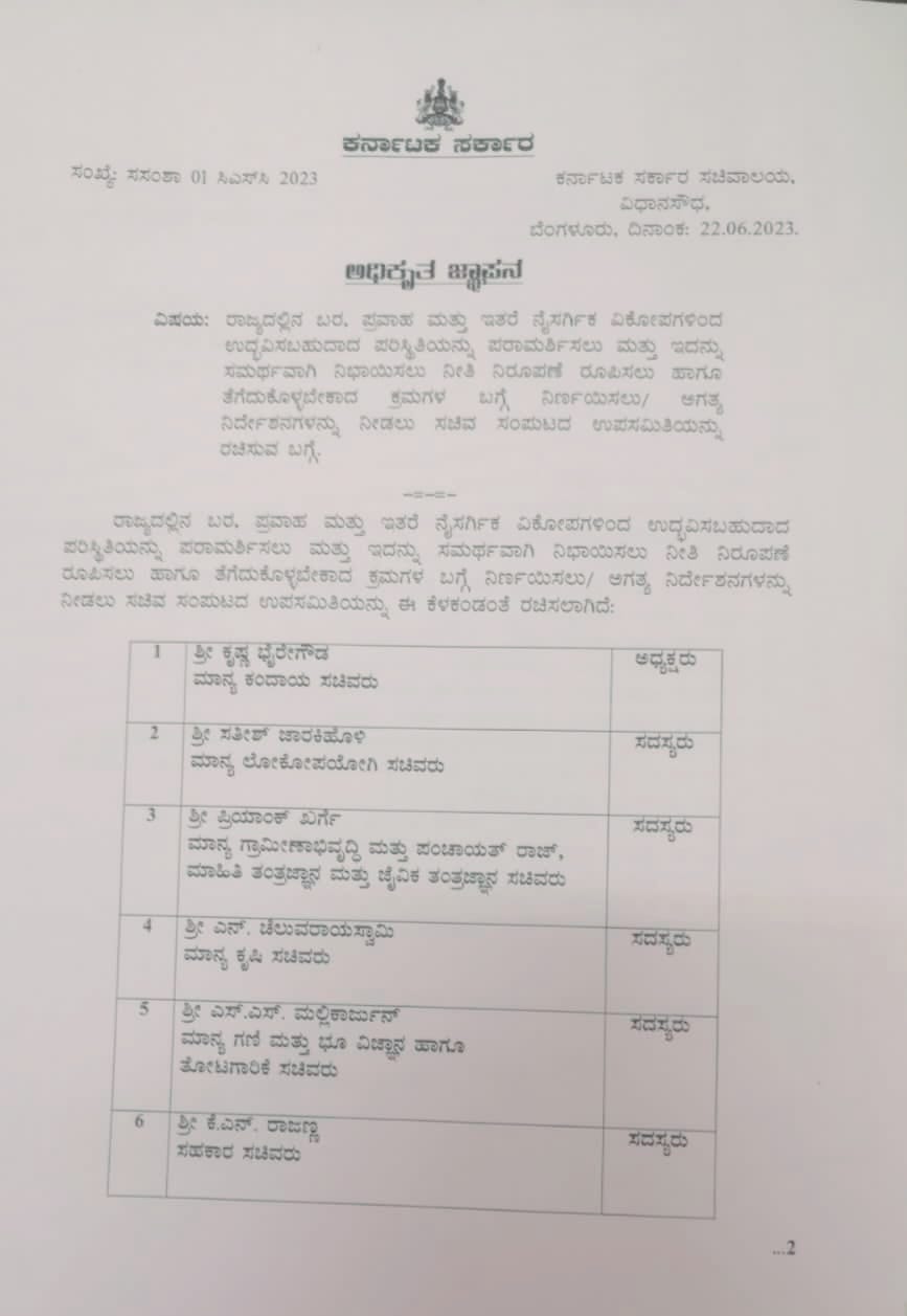ಬರ, ಪ್ರವಾಹ ಮತ್ತು ನೈಸರ್ಗಿಕ ವಿಕೋಪ ನಿರ್ವಹಣೆಗೆ ಸಂಪುಟ ಉಪ ಸಮಿತಿ: ಸರಕಾರ ಆದೇಶ