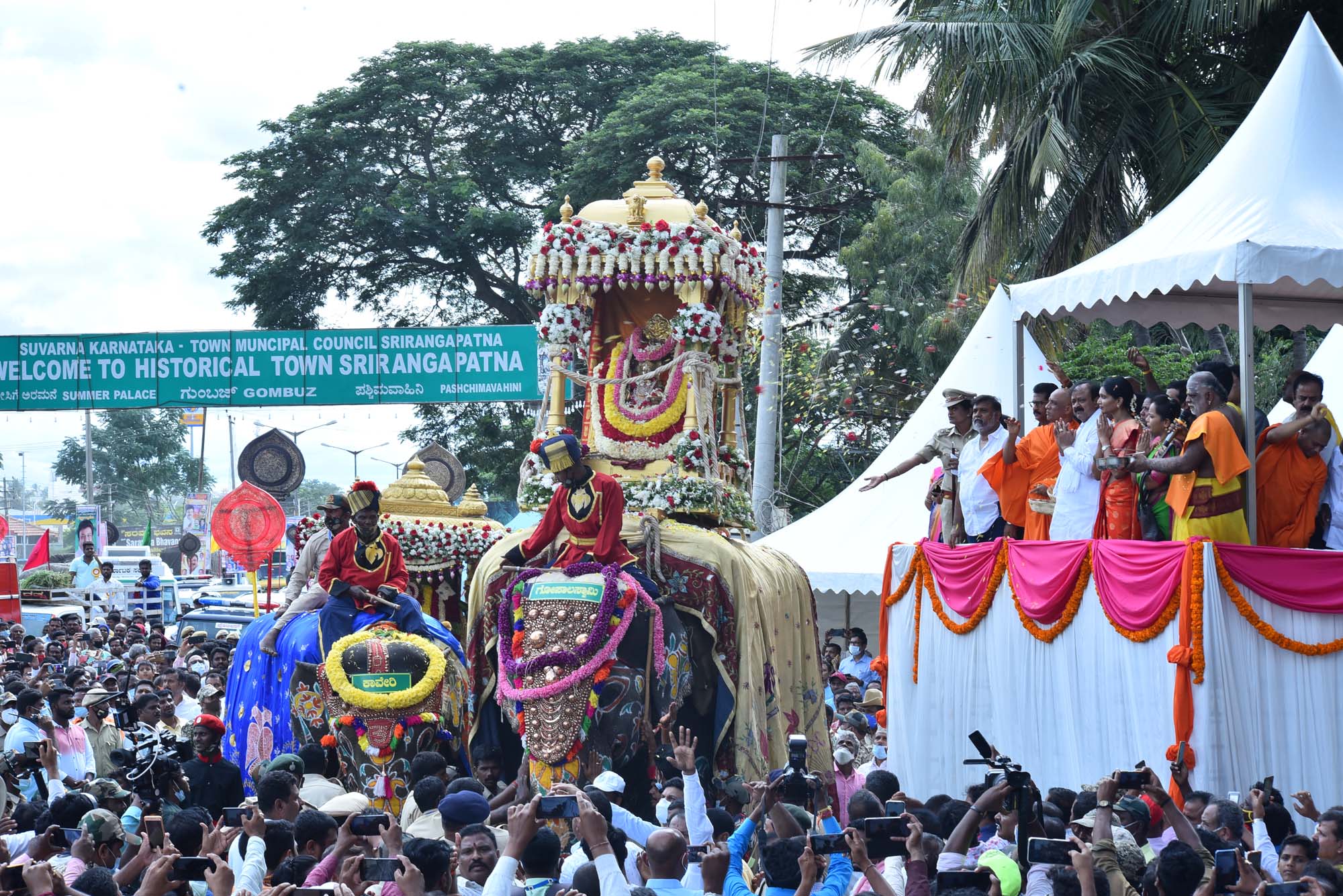 ಪಟಾಕಿ, ವಾದ್ಯಗಳ ಸದ್ದು ಕೇಳಿದ ತಕ್ಷಣ ಆನೆಗಳು ಬೆದರಿದವು. ಗಾಬರಿಗೊಂಡ ಜನರು ಚೆಲ್ಲಾಪಿಲ್ಲಿಯಾಗಿ ಓಡಿದರು. ವಾದ್ಯ, ತಮಟೆ ಸದ್ದನ್ನು ನಿಲ್ಲಿಸಿದ ತಕ್ಷಣ ಆನೆಗಳು ಸಮಾಧಾನದಿಂದ ನಿಂತುಕೊಂಡವು. ಆದರೂ, ಮುನ್ನೆಚ್ಚರಿಕೆ ಕ್ರಮವಾಗಿ ಜಂಬೂಸವಾರಿಯನ್ನು ಸ್ಥಗಿತಗೊಳಿಸಿ ಚಾಮುಂಡೇಶ್ವರಿ ದೇವಿ ವಿಗ್ರಹವನ್ನು ಬೆಳ್ಳಿರಥದಲ್ಲಿ ಕೂರಿಸಿ ಮೆರವಣಿಗೆ ನಡೆಸಲಾಯಿತು. ನಂತರ, ಕಲಾತಂಡಗಳ ಸಮೇತ ಮೆರವಣಿಗೆ ಶ್ರೀರಂಗಪಟ್ಟಣದ ಶ್ರೀರಂಗನಾಥಸ್ವಾಮಿ ದೇವಾಲಯದ ಆವರಣವನ್ನು ಸಾಂಗವಾಗಿ ತಲುಪಿತು.