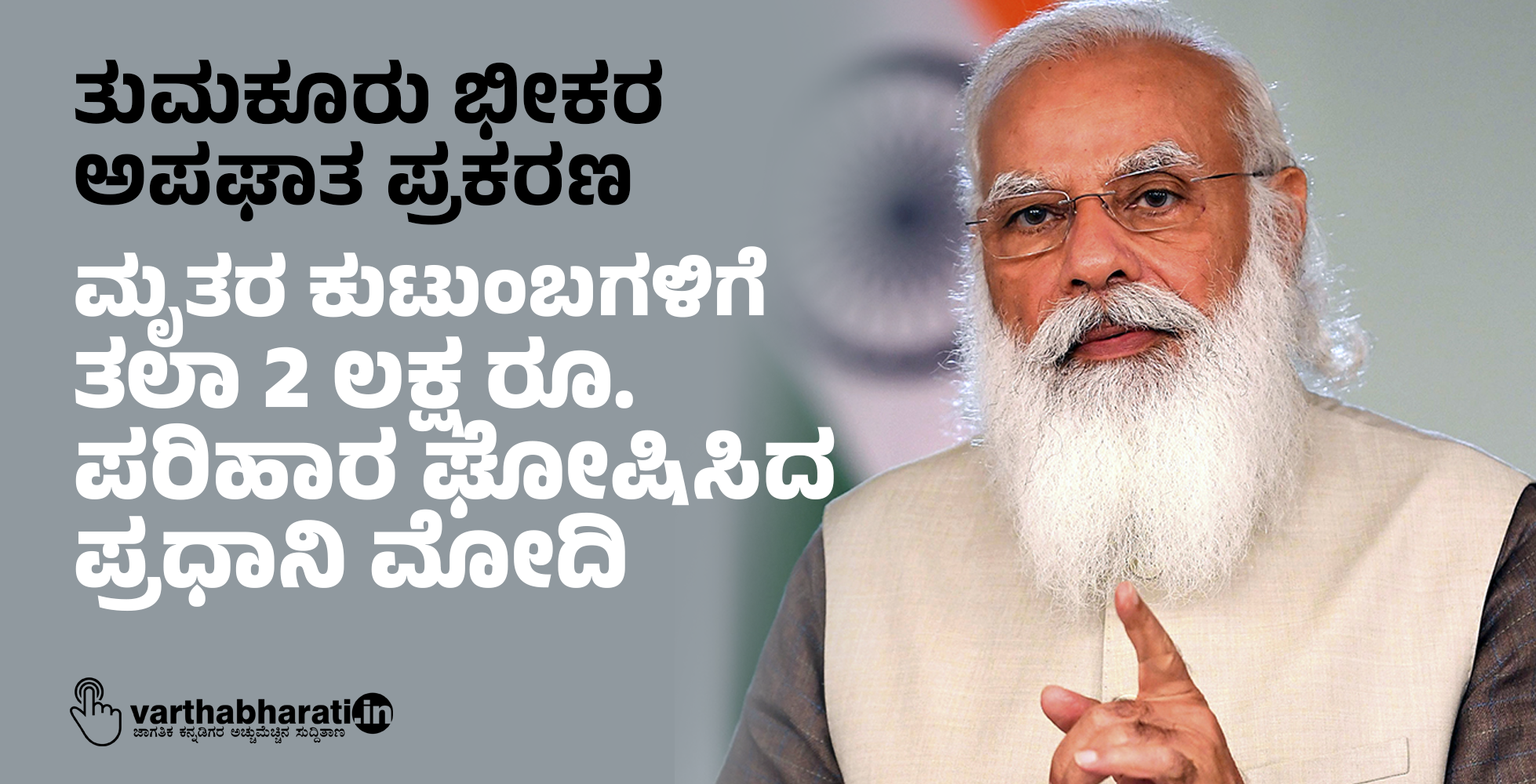 ಕರ್ನಾಟಕದ ತುಮಕೂರು ಜಿಲ್ಲೆಯಲ್ಲಿ ನಡೆದ ಅಪಘಾತ ಹೃದಯ ವಿದ್ರಾವಕ.ಅಪಘಾತದಲ್ಲಿ ಜೀವ ಕಳೆದು ಕೊಂಡವರಿಗೆ ಸಂತಾಪಗಳು.ಗಾಯಗೊಂಡವರು ಶೀಘ್ರ ಗುಣಮುಖರಾಗಲೆಂದು ಪ್ರಾರ್ಥನೆ.ಮೃತರ ಕುಟುಂಬದವರಿಗೆ ಪ್ರಧಾನ ಮಂತ್ರಿಗಳ ರಾಷ್ಟ್ರೀಯ ಪರಿಹಾರ ನಿಧಿಯಿಂದ ತಲಾ ಎರಡು ಲಕ್ಷ ರೂಪಾಯಿ ಹಾಗೂ ಗಾಯಗೊಂಡವರಿಗೆ ತಲಾ 50 ಸಾವಿರ ರೂಪಾಯಿ ಪರಿಹಾರ ನೀಡಲಾಗುವುದು: PM