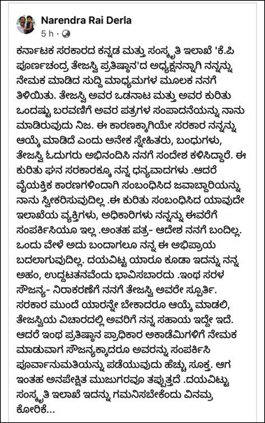 ದಯವಿಟ್ಟ ಯಾರೂ ಕೂಡಾ ಇದನ್ನು ನನ್ನ ಅಹಂ, ಉದ್ದಟತನವೆಂದು ಭಾವಿಸಬಾರದು .ಇಂಥ ಸರಳ ಸೌಜನ್ಯ- ನಿರಾಕರಣೆಗೆ ನನಗೆ ತೇಜಸ್ವಿ ಅವರೇ ಸ್ಪೂರ್ತಿ. ಸರಕಾರ ಮುಂದೆ ಯಾರನ್ನೇ ಬೇಕಾದರೂ ಆಯ್ಕೆ ಮಾಡಲಿ, ತೇಜಸ್ವಿಯ ವಿಚಾರದಲ್ಲಿ ಅವರಿಗೆ ನನ್ನ ಸಹಾಯ ಇದ್ದೇ ಇದೆ. ಆದರೆ ಇಂಥ ಪ್ರತಿಷ್ಠಾನ ಪ್ರಾಧಿಕಾರ ಅಕಾಡೆಮಿಗಳಿಗೆ ನೇಮಕ ಮಾಡುವಾಗ ಸೌಜನ್ಯಕ್ಕಾದರೂ ಅವರನ್ನು ಸಂಪರ್ಕಿಸಿ ಪೂರ್ವಾನುಮತಿಯನ್ನು ಪಡೆಯುವುದು ಹೆಚ್ಚು ಸೂಕ್ತ. ಆಗ ಇಂತಹ ಅನಪೇಕ್ಷಿತ ಮುಜುಗರವೂ ತಪ್ಪುತ್ತದೆ .ದಯವಿಟ್ಟು ಸಂಸ್ಕೃತಿ ಇಲಾಖೆ ಇದನ್ನು ಗಮನಿಸಬೇಕೆಂದು ವಿನಮ್ರ ಕೋರಿಕೆ... ಎಂದು ನರೇಂದ್ರ ರೈ ದೇರ್ಲ ಅವರು ಸರ್ಕಾರಕ್ಕೆ ಪತ್ರ ಬರೆದಿದ್ದಾರೆ.