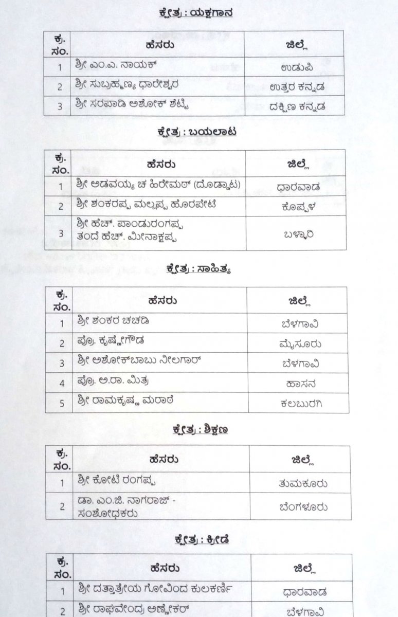 ಸಾಹಿತಿ ಪ್ರೊ.ಕೃಷ್ಣೇಗೌಡ, ನಿವೃತ್ತ ಐಎಎಸ್ ಅಧಿಕಾರಿ ಮದನ್ ಗೋಪಾಲ್, ವನ ಸಂರಕ್ಷಣೆಗಾಗಿ ಜೀವನವನ್ನೆ ಮುಡುಪಾಗಿಟ್ಟ ರಾಮನಗರದ ಸಾಲುಮರದ ನಿಂಗಣ್ಣ, ಹಿರಿಯ ನಟರಾದ ದತ್ತಣ್ಣ, ಅವಿನಾಶ್, ಉಡುಪಿ ಜಿಲ್ಲೆಯ ದೈವನರ್ತಕ ಗುಡ್ಡ ಪಾಣಾರ, ಕಿರುತೆರೆ ನಟ ಸಿಹಿಕಹಿ ಚಂದ್ರು, ಯಕ್ಷಗಾನ ಕಲಾವಿದರಾದ ಡಾ.ಎಂ.ಪ್ರಭಾಕರ ಜೋಷಿ, ಸುಬ್ರಹ್ಮಣ್ಯ ಧಾರೇಶ್ವರ, ವೀರಗಾಸೆ ಕಲಾವಿದ ಹಾವೇರಿಯ ಮಹೇಶ್ವರಗೌಡ ಲಿಂಗದಹಳ್ಳಿ, ಕಮಲಮ್ಮ ಸೂಲಗಿತ್ತಿ, ಹಿರಿಯ ಸಂಗೀತ ವಿದ್ವಾಂಸ ಅನಂತಾಚಾರ್ಯ ಬಾಳಾಚಾರ್ಯ, ಹಿರಿಯ ಪತ್ರಕರ್ತರಾದ ಎಚ್.ಆರ್.ಶ್ರೀಶಾ, ಜಿ.ಎಂ.ಶಿರಹಟ್ಟಿ, ಹಿರಿಯ ಸಂಶೋಧಕ ಡಾ.ಎಂ.ಜಿ. ನಾಗರಾಜ್ ಸೇರಿದಂತೆ 67 ಮಂದಿ ಗಣ್ಯರನ್ನು ಪ್ರಶಸ್ತಿಗೆ ಆಯ್ಕೆ ಮಾಡಲಾಗಿದೆ.