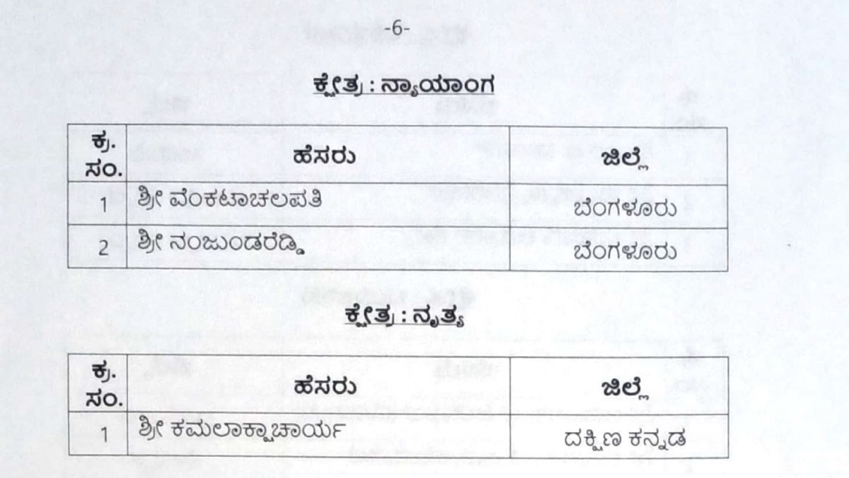 ಯಕ್ಷಗಾನ: ಎಂ.ಎ.ನಾಯಕ್(ಉಡುಪಿ), ಸುಬ್ರಹ್ಮಣ್ಯ ಧಾರೇಶ್ವರ(ಉತ್ತರ ಕನ್ನಡ), ಸರಪಾಡಿ ಅಶೋಕ್ ಶೆಟ್ಟಿ(ದಕ್ಷಿಣ ಕನ್ನಡ).