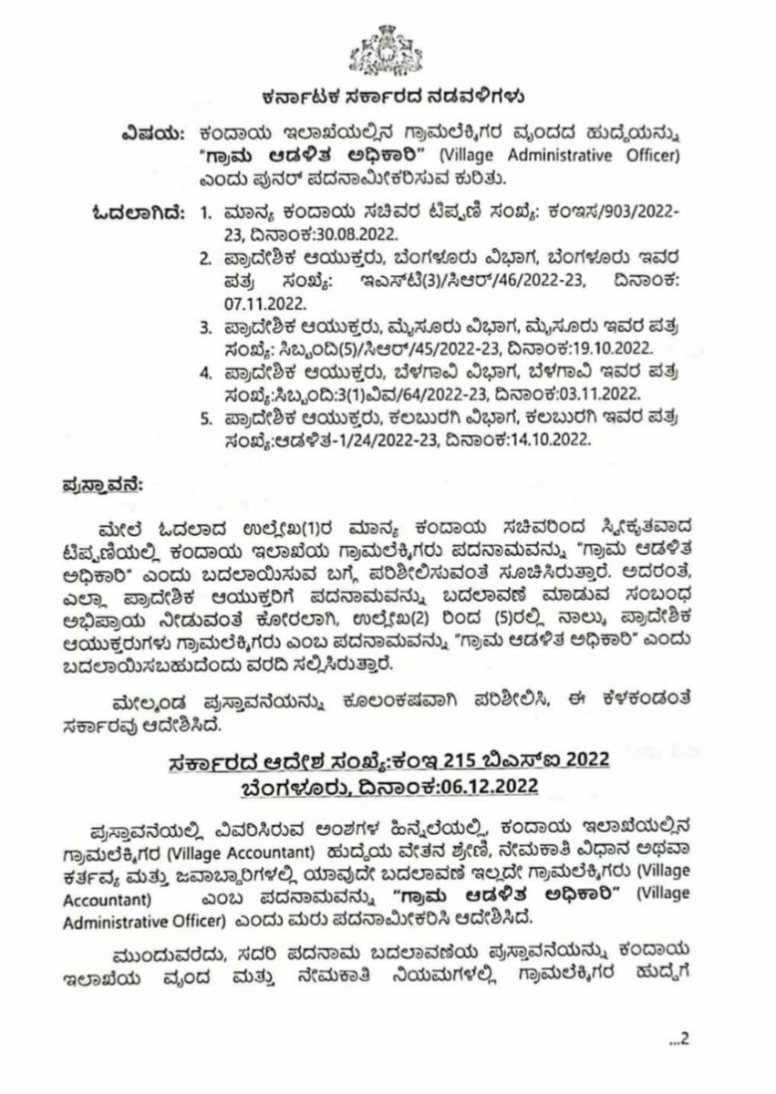 ಗ್ರಾಮ ಲೆಕ್ಕಿಗರು ಇನ್ನು ಮುಂದೆ ‘ಗ್ರಾಮ ಆಡಳಿತ ಅಧಿಕಾರಿ’: ಸರಕಾರ ಆದೇಶ