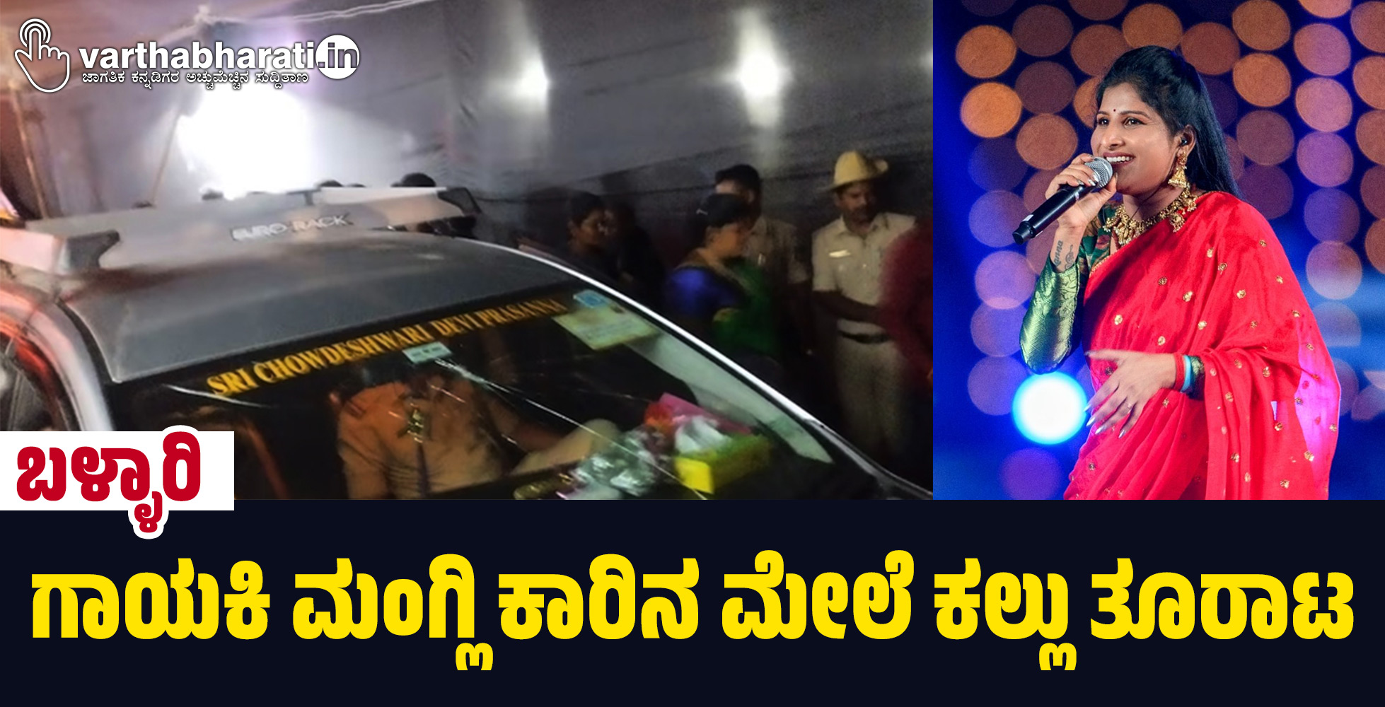ಬಳ್ಳಾರಿ: ಇಲ್ಲಿನ ಮುನ್ಸಿಪಲ್ ಕಾಲೇಜು ಮೈದಾನದಲ್ಲಿ ನಡೆದ ಕಾರ್ಯಕ್ರಮವೊಂದರಲ್ಲಿ ಭಾಗವಹಿಸಿ ವಾಪಸ್ ಆಗುತ್ತಿದ್ದ ಗಾಯಕಿ ಮಂಗ್ಲಿ ಅವರ ಕಾರಿಗೆ ಕಲ್ಲು ತೂರಾಟ ನಡೆದ ಘಟನೆ ಶನಿವಾರ ರಾತ್ರಿ ವರದಿಯಾಗಿದೆ.