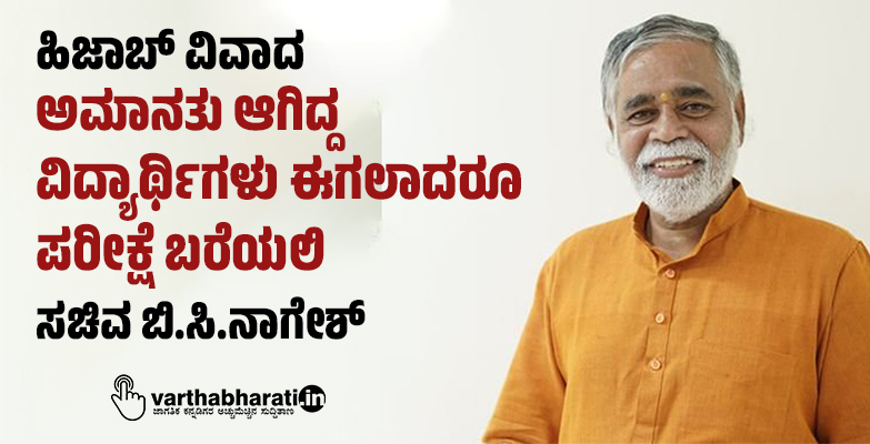 ಬೆಂಗಳೂರು, ಮಾ.8: ಹಿಜಾಬ್ ವಿವಾದ ಸಂಬಂಧ ಕಳೆದ ಬಾರಿ ಅಮಾನತು ಆಗಿದ್ದ ವಿದ್ಯಾರ್ಥಿಗಳು ಈ ಬಾರಿಯಾದರೂ ದ್ವಿತೀಯ ಪಿಯುಸಿ ವಾರ್ಷಿಕ ಪರೀಕ್ಷೆ ಬರೆಯಲಿ ಎಂದು ಶಾಲಾ ಶಿಕ್ಷಣ ಮತ್ತು ಸಾಕ್ಷರತಾ ಸಚಿವ ಬಿ.ಸಿ.ನಾಗೇಶ್ ಸಲಹೆ ನೀಡಿದ್ದಾರೆ.