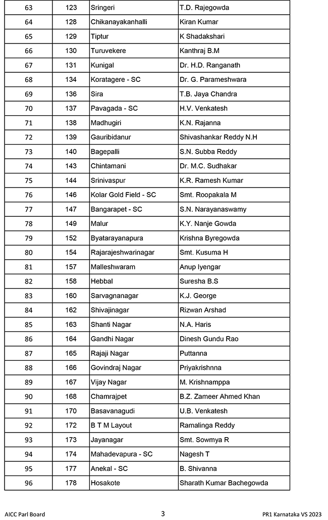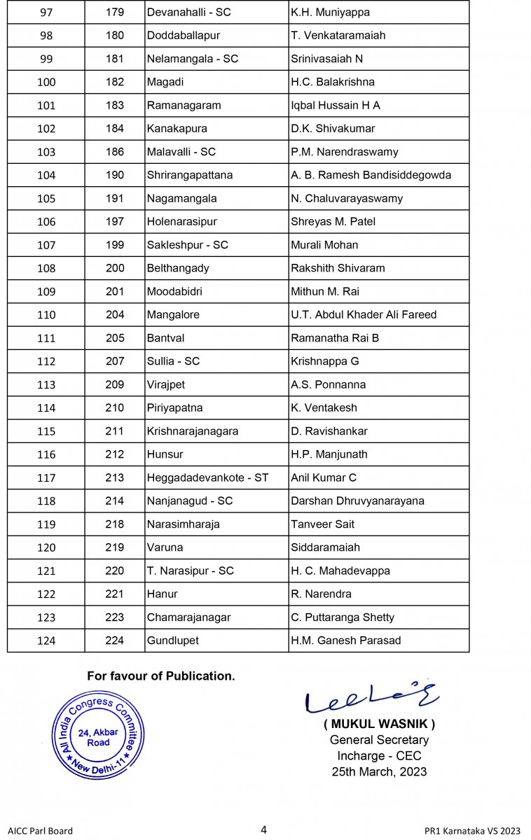 ವಿಪಕ್ಷ ನಾಯಕ ಸಿದ್ದರಾಮಯ್ಯ ಅವರಿಗೆ ವರುಣಾ ಕ್ಷೇತ್ರದಿಂದ ಟಿಕೆಟ್ ಅಂತಿಮಗೊಳಿಸಿದ್ದು, ಉಳಿದಂತ ಕನಕಪುರ ಕ್ಷೇತ್ರದಿಂದ ಕೆಪಿಸಿಸಿ ಅಧ್ಯಕ್ಷ ಡಿ.ಕೆ ಶಿವಕುಮಾರ್, ವಿಧಾನಸಭೆ ವಿಪಕ್ಷ ಉಪ ನಾಯಕ ಯು.ಟಿ ಖಾದರ್ ಮಂಗಳೂರು ಕ್ಷೇತ್ರದಿಂದ ಕಣಕ್ಕಿಳಿಯಲಿದ್ದಾರೆ.