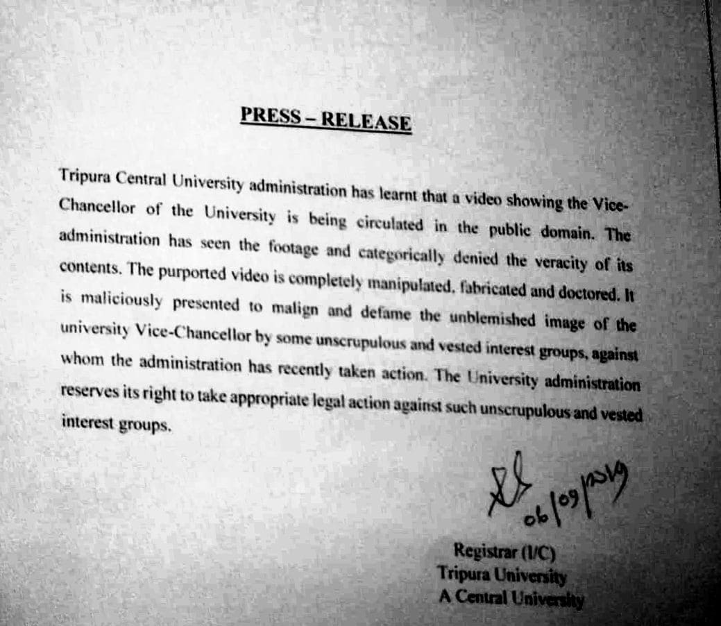 ಕುಟುಕು ಕಾರ್ಯಾಚರಣೆ: ಲಂಚ ಪಡೆದ ತ್ರಿಪುರಾ ವಿವಿ ಕುಲಪತಿ !