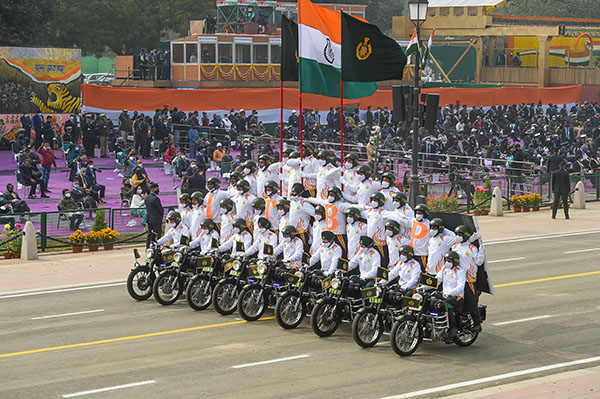 ಸಿಆರ್ಪಿಎಫ್ ಸಿಬ್ಬಂದಿಗಳು ತಮ್ಮ ಧ್ಯೇಯಗೀತೆಯನ್ನು ಹಾಡುತ್ತ ನೀಡಿದ ಪ್ರದರ್ಶನ ಸಶಸ್ತ್ರ ಪಡೆಗಳ ಅತ್ಯಂತ ವರ್ಣರಂಜಿತ ಪ್ರದರ್ಶನಗಳಲ್ಲೊಂದಾಗಿತ್ತು.ಆಗಸ ಮತ್ತು ನೆಲದಲ್ಲಿನ ಪ್ರದರ್ಶನಗಳ ಜೊತೆಗೆ ಪ್ರಧಾನಿ ನರೇಂದ್ರ ಮೋದಿಯವರ ಉಡುಪು ಸಹ ಗಮನವನ್ನು ಸೆಳೆದಿತ್ತು. ಉತ್ತರಾಖಂಡದ ಟೊಪ್ಪಿಗೆ ಮತ್ತು ಮಣಿಪುರದ ಕಂಠವಸ್ತ್ರವನ್ನು ಅವರು ಧರಿಸಿದ್ದರು. ಇವೆರಡೂ ರಾಜ್ಯಗಳು ವಿಧಾನಸಭಾ ಚುನಾವಣೆಗಳಿಗೆ ಸಜ್ಜಾಗಿವೆ.