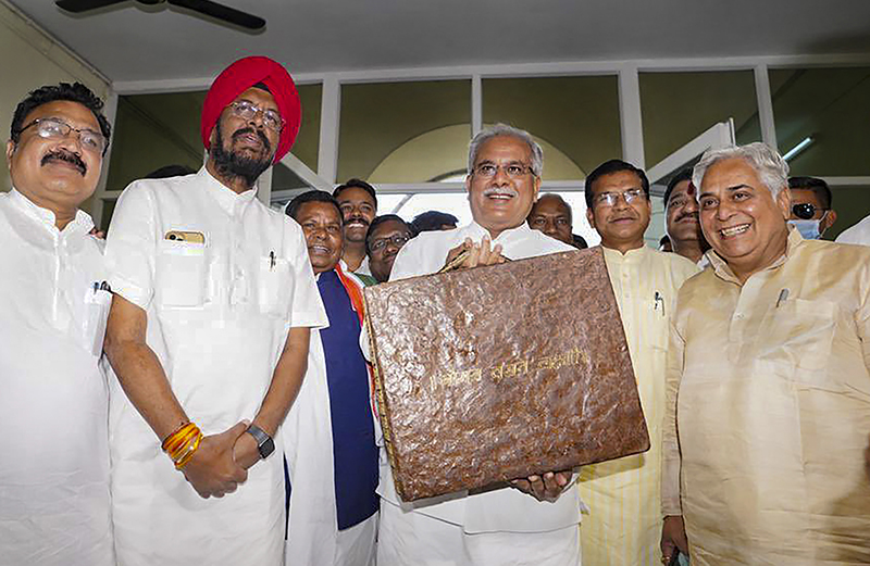 ರಾಜ್ಯ ಬಜೆಟ್ ಮಂಡನೆಗೆ ಸೆಗಣಿಯಿಂದ ತಯಾರಿಸಿದ ಬ್ರೀಫ್ ಕೇಸ್ ನೊಂದಿಗೆ ಆಗಮಿಸಿದ ಛತ್ತೀಸ್ಗಢ ಸಿಎಂ