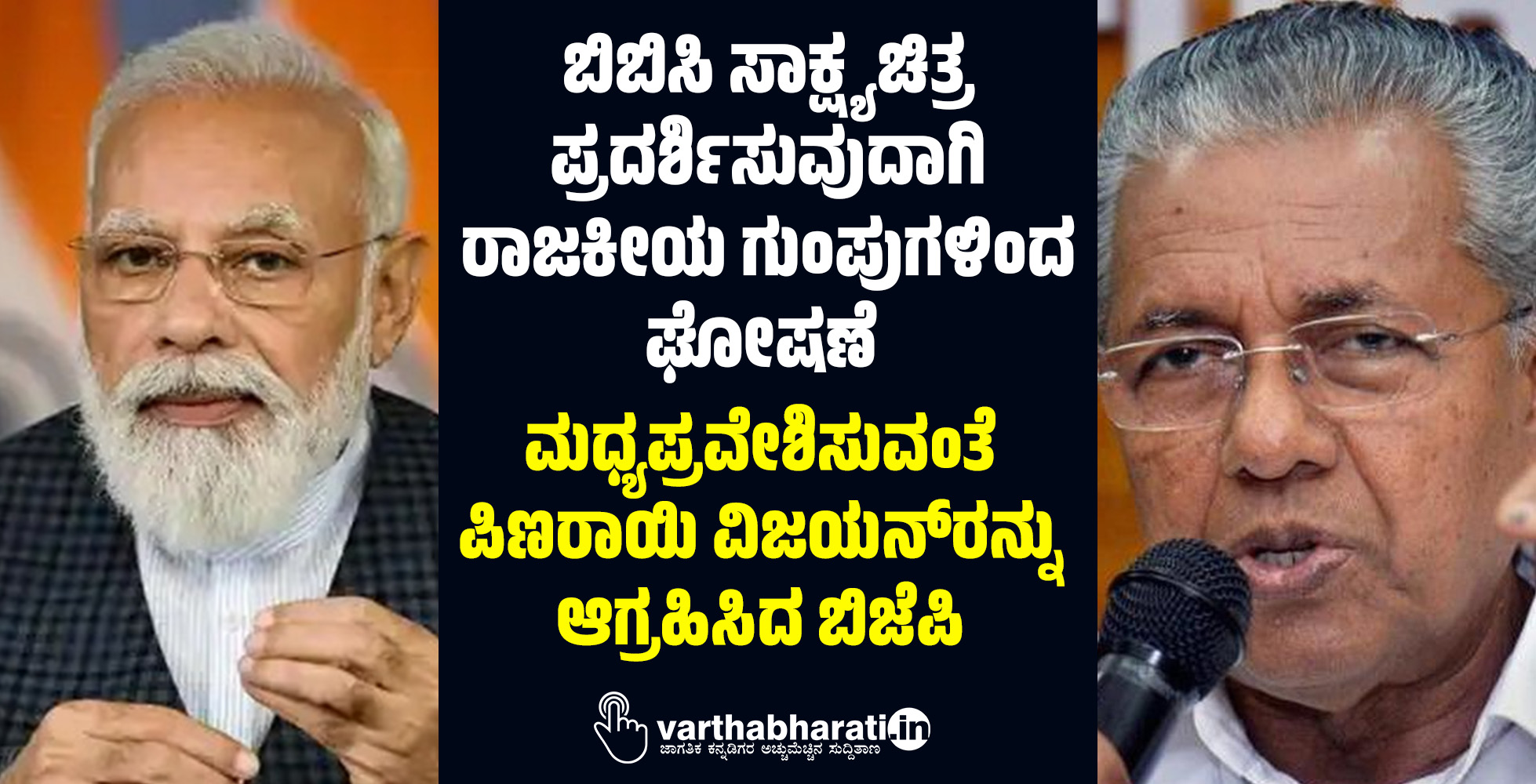 ತಿರುವನಂತಪುರ (ಕೇರಳ), ಜ. 24: ಬಿಬಿಸಿಯ ವಿವಾದಾತ್ಮಕ ಸಾಕ್ಷ್ಯಚಿತ್ರ ‘‘ಇಂಡಿಯಾ: ದಿ ಮೋದಿ ಕ್ವಶ್ಚನ್’’ ಅನ್ನು ರಾಜ್ಯದಲ್ಲಿ ಪ್ರದರ್ಶಿಸಲಾಗುವುದು ಎಂದು ಕೇರಳದ ಹಲವು ರಾಜಕೀಯ ಗುಂಪುಗಳು ಮಂಗಳವಾರ ಘೋಷಿಸಿವೆ. ಈ ಹಿನ್ನೆಲೆಯಲ್ಲಿ ಮುಖ್ಯಮಂತ್ರಿ ಪಿಣರಾಯಿ ವಿಜಯನ್ ಅವರು ಮಧ್ಯಪ್ರವೇಶಿಸುವಂತೆ ಹಾಗೂ ಅಂತಹ ಪ್ರಯತ್ನಕ್ಕೆ ಕಡಿವಾಣ ಹಾಕುವಂತೆ ಬಿಜೆಪಿ ಆಗ್ರಹಿಸಿದೆ.