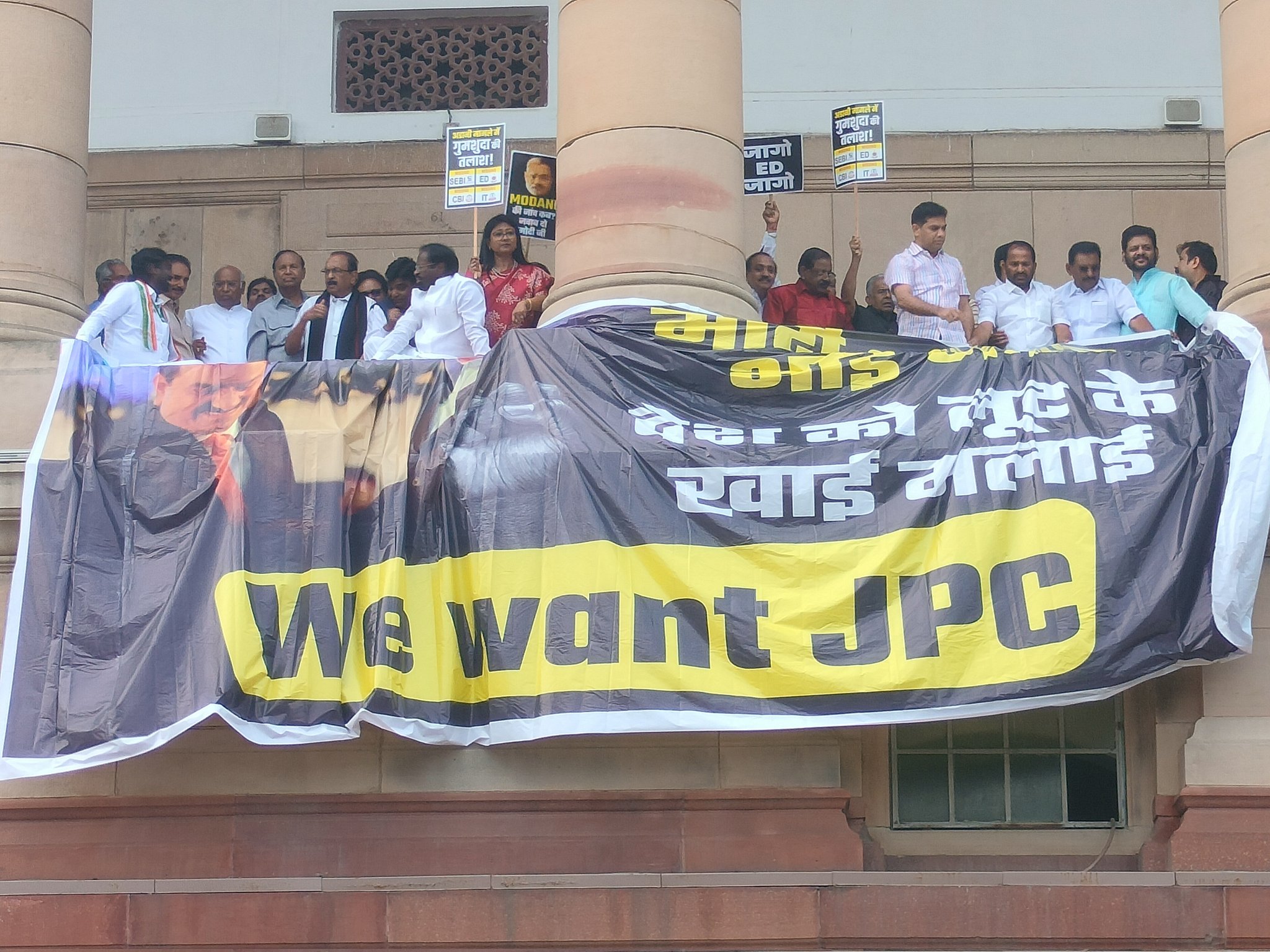 ಹೊಸದಿಲ್ಲಿ: ವಿರೋಧ ಪಕ್ಷದ ಸಂಸದರು ಮಂಗಳವಾರ ಸಂಸತ್ ಭವನದ ಮೊದಲ ಮಹಡಿಯಲ್ಲಿ ಪ್ರತಿಭಟನೆ ನಡೆಸಿದರು, ಅದಾನಿ ಗ್ರೂಪ್ ವಿರುದ್ಧ ವಂಚನೆ ಆರೋಪಗಳನ್ನು ಪರಿಶೀಲಿಸಲು ಜಂಟಿ ಸಂಸದೀಯ ಸಮಿತಿ(ಜೆಪಿಸಿ) ಯನ್ನು ರಚಿಸಬೇಕು ಎಂದು ಒತ್ತಾಯಿಸಿದರು. ಸಂಸತ್ತಿನಲ್ಲಿ ಪ್ರತಿಭಟನೆಯ ನಡುವೆಯೇ ಪ್ರತಿಪಕ್ಷಗಳು 'ವಿ ವಾಂಟ್ ಜೆಪಿಸಿ' ಎಂದು ಬರೆದಿರುವ ಬೃಹತ್ ಬ್ಯಾನರ್ ಹಾಗೂ ಭಿತ್ತಿಪತ್ರವನ್ನು ಪ್ರದರ್ಶಿಸಿದರು.