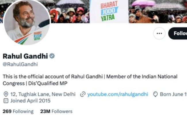 "ಇದು ರಾಹುಲ್ ಗಾಂಧಿಯವರ ಅಧಿಕೃತ ಖಾತೆ | ಭಾರತೀಯ ರಾಷ್ಟ್ರೀಯ ಕಾಂಗ್ರೆಸ್ ಸದಸ್ಯ | "ಡಿಸ್'ಕ್ವಾಲಿಫೈಡ್ ಎಂಪಿ " ಎಂದು ಬಯೋದಲ್ಲಿ ಬರೆಯಲಾಗಿದೆ.