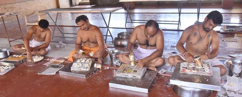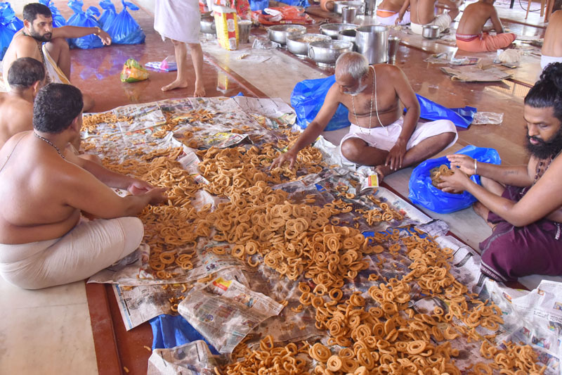 ಮಠದ ಭೋಜನ ಶಾಲೆಯಲ್ಲಿ ಕಳೆದ ಮೂರ್ನಾಲ್ಕು ದಿನಗಳಿಂದ ವಿವಿಧ ಬಗೆಯ ಲಾಡುಗಳನ್ನು ಹಾಗೂ ವಿವಿಧ ಗಾತ್ರದ ಚಕ್ಕುಲಿಗಳನ್ನು ಸಾವಿರಾರು ಸಂಖ್ಯೆಯಲ್ಲಿ ತಯಾರಿಸುವ ಕೆಲಸ ನಡೆಯುತ್ತಿದೆ. ಇದನ್ನು ಭಕ್ತರಿಗೆ ಚಿಣ್ಣರ ಸಂತರ್ಪಣೆಯ ಶಾಲೆಯ ಮಕ್ಕಳಿಗೆ ವಿತರಿಸಲು ಸಣ್ಣ ಬಟ್ಟೆಯ ಚೀಲಗಳಲ್ಲಿ ಪ್ಯಾಕ್ ಮಾಡಲಾಗುತ್ತಿದೆ.