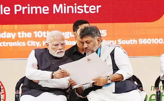 ರವಿವಾರ ಎಲೆಕ್ಟ್ರಾನಿಕ್ ಸಿಟಿಯ ಐಐಐಟಿ ಆಡಿಟೋರಿಯಂನಲ್ಲಿ ಏರ್ಪಡಿಸಿದ್ದ ಮೆಟ್ರೋ ರೈಲು ಹಳದಿ ಮಾರ್ಗ ಉದ್ಘಾಟನೆ ಸಮಾರಂಭದ ವೇದಿಕೆ ಮೇಲೆ ಪ್ರಧಾನಿಗೆ ಡಿ.ಕೆ.ಶಿವಕುಮಾರ್ ಮನವಿ ಸಲ್ಲಿಸಿದರು.