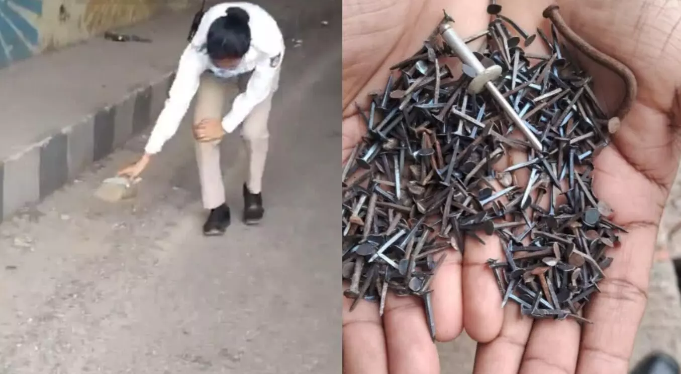ಬೆಂಗಳೂರು | ರಸ್ತೆಯಲ್ಲಿ ರಾಶಿ ಮೊಳೆಗಳು ಪತ್ತೆ: ಹೆಕ್ಕಿ ತೆಗೆದ ಟ್ರಾಫಿಕ್ ಪೊಲೀಸ್!