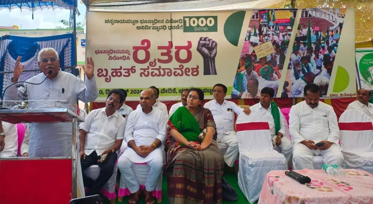 ಸೋಮವಾರ ದೇವನಹಳ್ಳಿ ತಾಲೂಕು ಚನ್ನರಾಯಪಟ್ಟಣ ಹೋಬಳಿಯ 13 ಹಳ್ಳಿಗಳ ರೈತರು ಕೆಐಎಡಿಬಿ ಭೂಸ್ವಾಧೀನವನ್ನು ವಿರೋಧಿಸಿ ಸಾವಿರನೇ ದಿನದ ಪ್ರಯುಕ್ತ ಹಮ್ಮಿಕೊಂಡಿದ್ದ ರೈತರ ಸಮಾವೇಶದಲ್ಲಿ ಭಾಗವಹಿಸಿ ಅವರು ಮಾತನಾಡಿದರು.