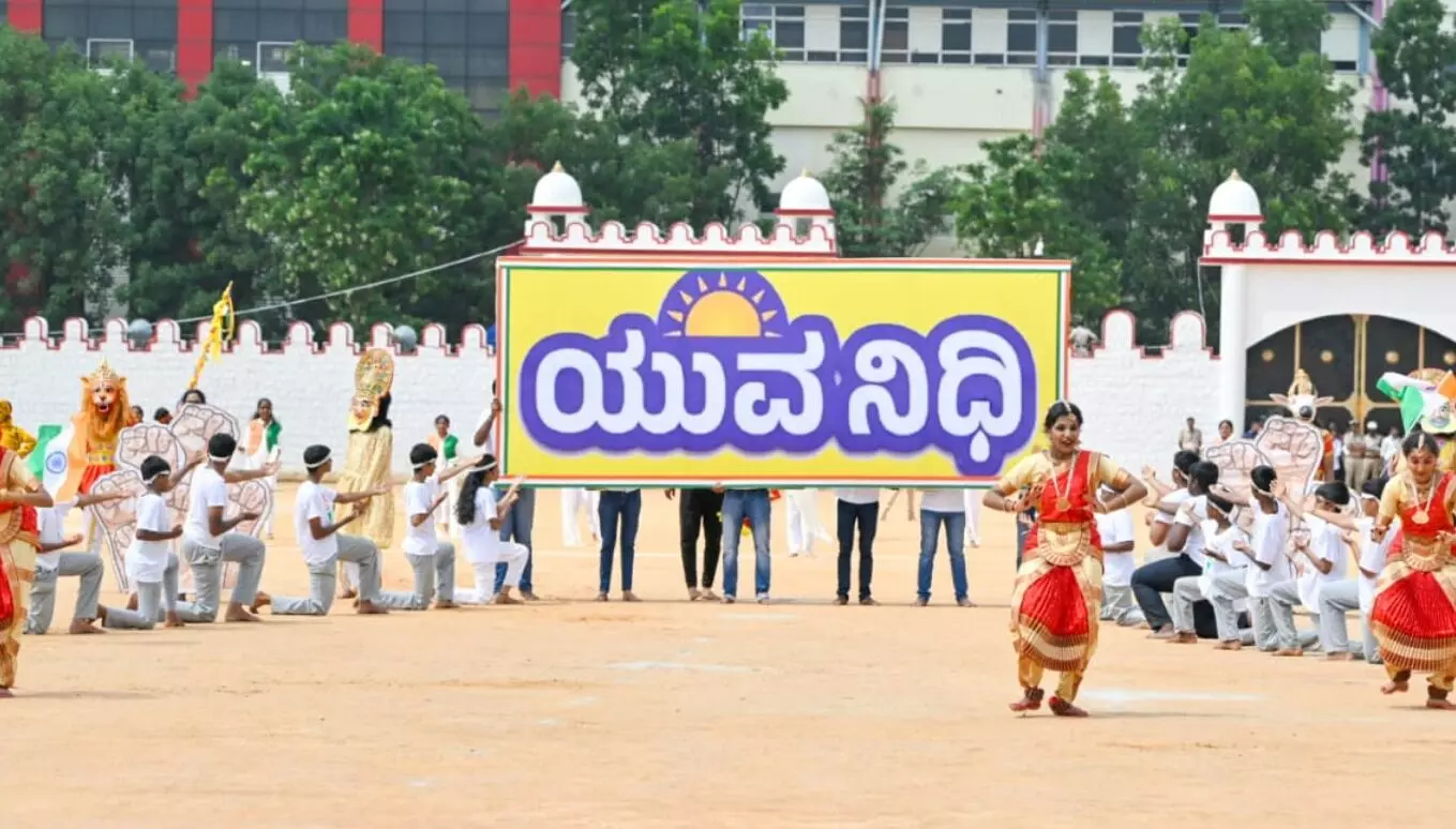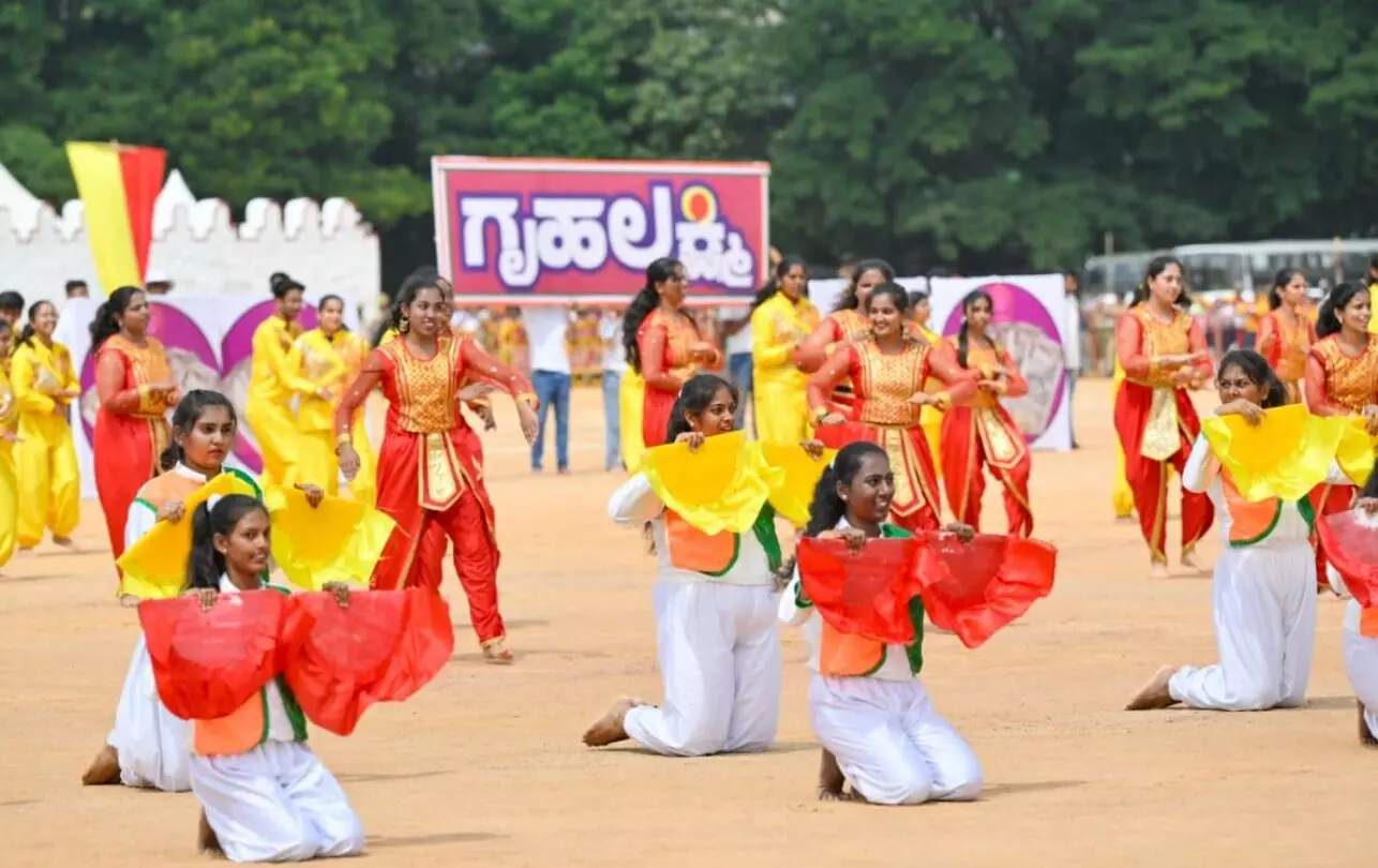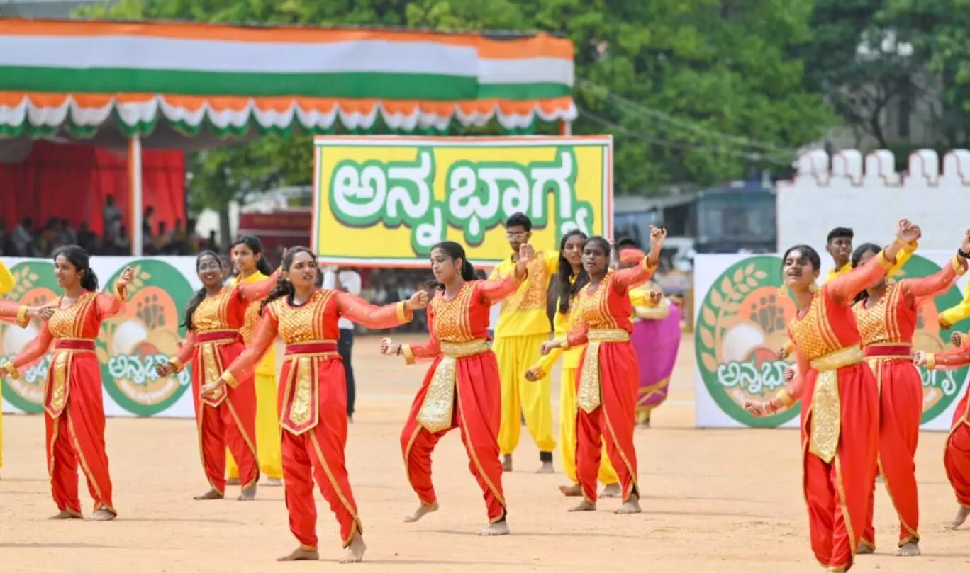 ಮನಸೆಳೆದ ಗ್ಯಾರಂಟಿ ಯೋಜನೆಗಳ ಗೀತೆ: ರಾಜ್ಯ ಸರಕಾರದ ಐದು ಮಹತ್ವಾಕಾಂಕ್ಷೆಯ ಗ್ಯಾರಂಟಿ ಯೋಜನೆಗಳ ಕುರಿತು ಗೀತೆಯೊಂದಕ್ಕೆ ಶಾಲಾ ಮಕ್ಕಳು ನೃತ್ಯ ಮಾಡಿದರು. ರಾಷ್ಟ್ರೀಯ ಸೇವಾ ಯೋಜನೆ ಹಾಗೂ ಯುವ ಸಬಲೀಕರಣ ಮತ್ತು ಕ್ರೀಡಾ ಇಲಾಖೆಯ ಸಹಯೋಗದಲ್ಲಿ 400 ವಿದ್ಯಾರ್ಥಿಗಳು ನಂದಿಧ್ವಜ, ರಾಷ್ಟ್ರಧ್ವಜ, ನಾಡಧ್ವಜ ಹಿಡಿದು ವೀರಗಾಸೆ, ಡೊಳ್ಳುಕುಣಿತ ಸೇರಿ ವಿವಿಧ ವೇಷಭೂಷಣಗಳನ್ನು ತೊಟ್ಟು ಗೀತೆಗೆ ನೃತ್ಯ ಮಾಡಿದರು.
