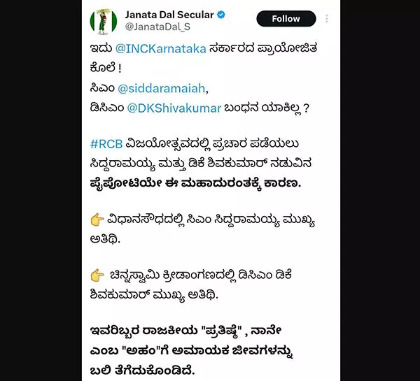 ವಿಧಾನಸೌಧದ ಮುಂಭಾಗದಲ್ಲಿ ನಡೆದ ಕಾರ್ಯಕ್ರಮದಲ್ಲಿ ಸಿಎಂ ಸಿದ್ದರಾಮಯ್ಯ ಮುಖ್ಯ ಅತಿಥಿ. ಚಿನ್ನಸ್ವಾಮಿ ಕ್ರೀಡಾಂಗಣದಲ್ಲಿ ನಡೆದ ಕಾರ್ಯಕ್ರಮದಲ್ಲಿ ಡಿಸಿಎಂ ಡಿಕೆ ಶಿವಕುಮಾರ್ ಮುಖ್ಯ ಅತಿಥಿ. ಇವರಿಬ್ಬರ ರಾಜಕೀಯ ಪ್ರತಿಷ್ಠೆ. ನಾನೇ ಎಂಬ ಅಹಂನಿಂದಾಗಿ ಅಮಾಯಕ ಜೀವಗಳನ್ನು ಬಲಿತೆಗೆದುಕೊಂಡಿದ್ದಾಗಿದೆ ಎಂದು ಜೆಡಿಎಸ್ ವಾಗ್ದಾಳಿ ನಡೆಸಿದೆ.