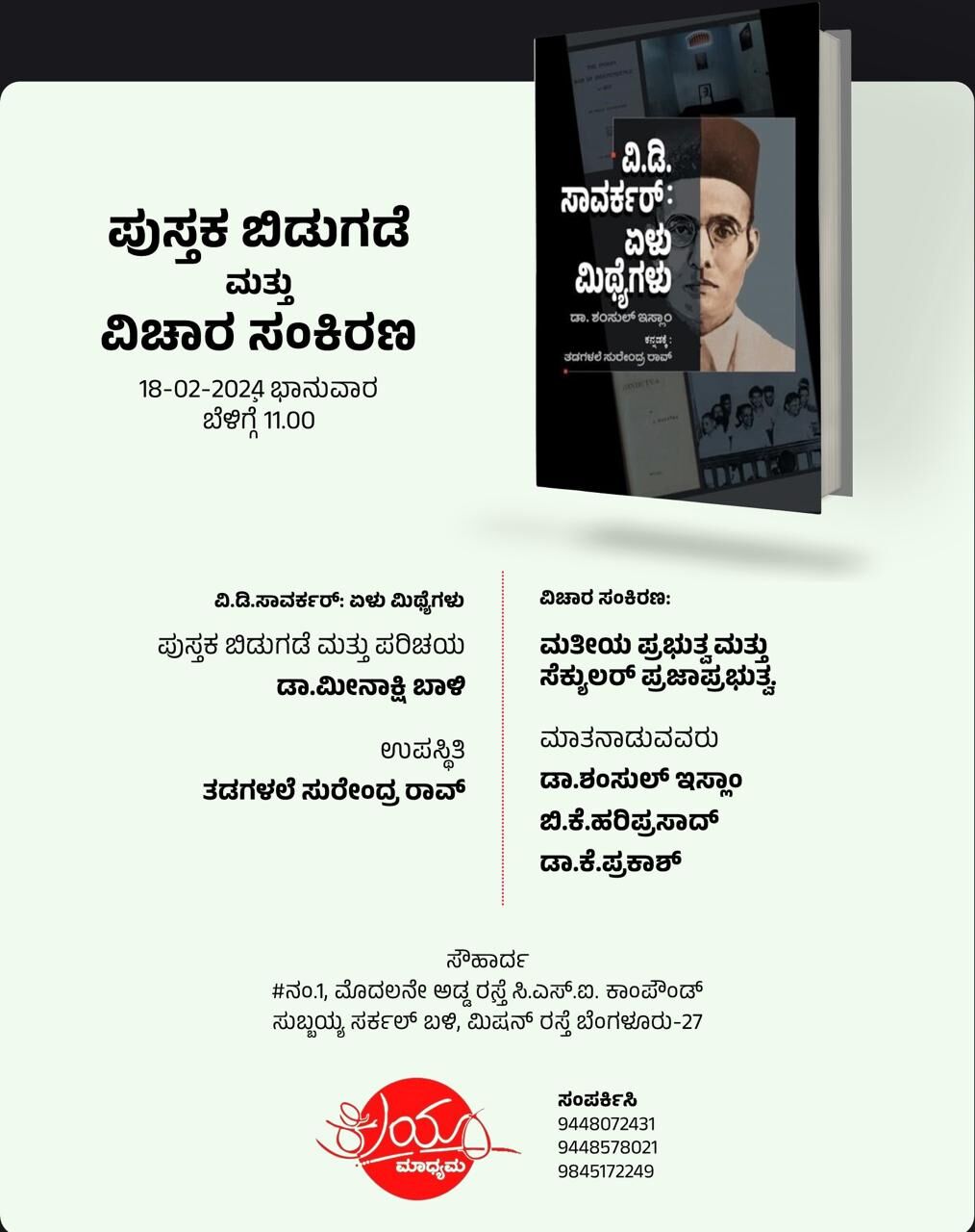 ಬೆಂಗಳೂರು: ಲೇಖಕ ಡಾ.ಶಂಸುಲ್ ಇಸ್ಲಾಂ ಅವರ ‘ವಿ.ಡಿ.ಸಾವರ್ಕರ್: ಏಳು ಮಿಥ್ಯೆಗಳು’ ಕೃತಿಯ ಕನ್ನಡ ಅನುವಾದಿತ ಪುಸ್ತಕ ಬಿಡುಗಡೆ ಮತ್ತು ‘ಮತೀಯ ಪ್ರಭುತ್ವ ಮತ್ತು ಸೆಕ್ಯುಲರ್ ಪ್ರಜಾಪ್ರಭುತ್ವ’ ವಿಷಯದ ಕುರಿತು ನಾಳೆ(ಫೆ.18)ಬೆಳಗ್ಗೆ 11ಗಂಟೆಗೆ ಮಿಷನ್ ರಸ್ತೆಯ ಸುಬ್ಬಯ್ಯ ವೃತ್ತದಲ್ಲಿನ ಸಿಎಸ್ಐ ಕಾಂಪೌಂಡ್ನ ಸೌಹಾರ್ದ ಸಭಾಂಗಣದಲ್ಲಿ ವಿಚಾರ ಸಂಕಿರಣವನ್ನು ಆಯೋಜಿಸಲಾಗಿದೆ.
