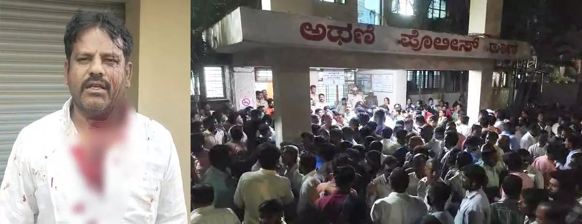 ನಿಂಗಪ್ಪ ಕರೆಣ್ಣವರ ಮೇಲಿನ ಹಲ್ಲೆಯನ್ನು ಖಂಡಿಸಿ, ಆರೋಪಿಗಳನ್ನು ತಕ್ಷಣ ಬಂಧಿಸುವಂತೆ ಒತ್ತಾಯಿಸಿ ಬಿಡಿಸಿಸಿ ಬ್ಯಾಂಕ್ ನೌಕರರು ಶನಿವಾರ ಅಥಣಿ ಪೊಲೀಸ್ ಠಾಣೆ ಮುಂದೆ ಧರಣಿ ನಡೆಸಿದರು.