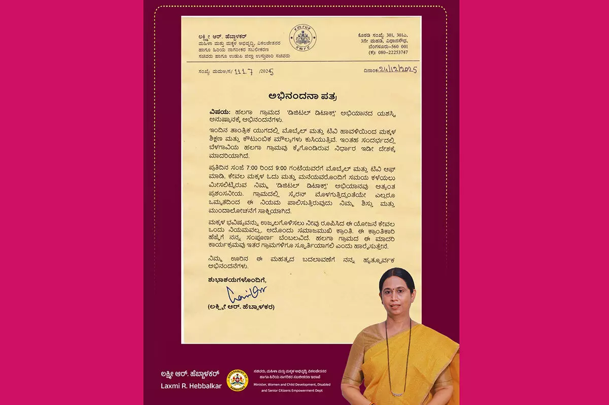 ಬೆಳಗಾವಿ: ಹಲಗಾ ಗ್ರಾಮದಲ್ಲಿ ಜಾರಿಗೆ ತಂದಿರುವ 'ಡಿಜಿಟಲ್ ಡಿಟಾಕ್ಸ್' ಅಭಿಯಾನಕ್ಕೆ ಕ್ಷೇತ್ರದ ಶಾಸಕರೂ ಆಗಿರುವ ಮಹಿಳಾ ಮತ್ತು ಮಕ್ಕಳ ಅಭಿವೃದ್ಧಿ ಸಚಿವೆ ಲಕ್ಷ್ಮೀ ಹೆಬ್ಬಾಳ್ಕರ್ ಪ್ರಶಂಸೆ ವ್ಯಕ್ತಪಡಿಸಿ ಅಭಿನಂದನಾ ಪತ್ರ ಕಳುಹಿಸಿದ್ದಾರೆ.