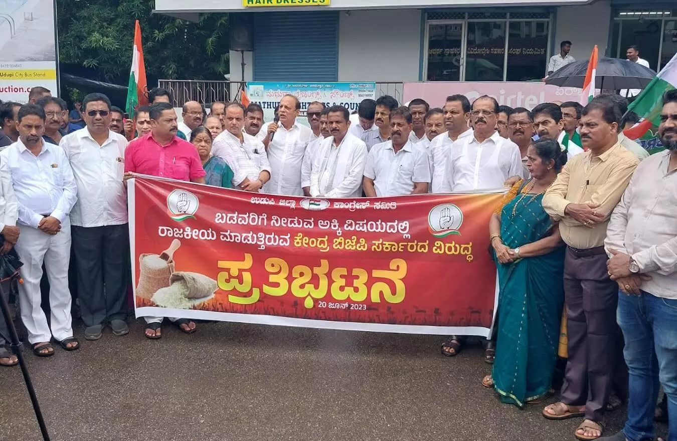 ಉಡುಪಿ: ಕಾಂಗ್ರೆಸ್ ಪಕ್ಷದ ಅನ್ನಭಾಗ್ಯ ಯೋಜನೆಗೆ ಹೆಚ್ಚುವರಿ ಅಕ್ಕಿ ನೀಡುವ ನಿರ್ಧಾರದಿಂದ ಹಿಂದೆ ಸರಿದು ಬಡವರ ಅನ್ನ ಕಿತ್ತುಕೊಳ್ಳಲು ಹೊರಟಿರುವ ಕೇಂದ್ರ ಬಿಜೆಪಿ ಸರಕಾರದ ವಿರುದ್ಧ ಉಡುಪಿ ಜಿಲ್ಲಾ ಕಾಂಗ್ರೆಸ್ ನೇತೃತ್ವದಲ್ಲಿ ಮಂಗಳವಾರ ಉಡುಪಿ ಬ್ರಹ್ಮಗಿರಿ ಸರ್ಕಲ್ ನಲ್ಲಿ ಪ್ರತಿಭಟನೆ ನಡೆಸಲಾಯಿತು.