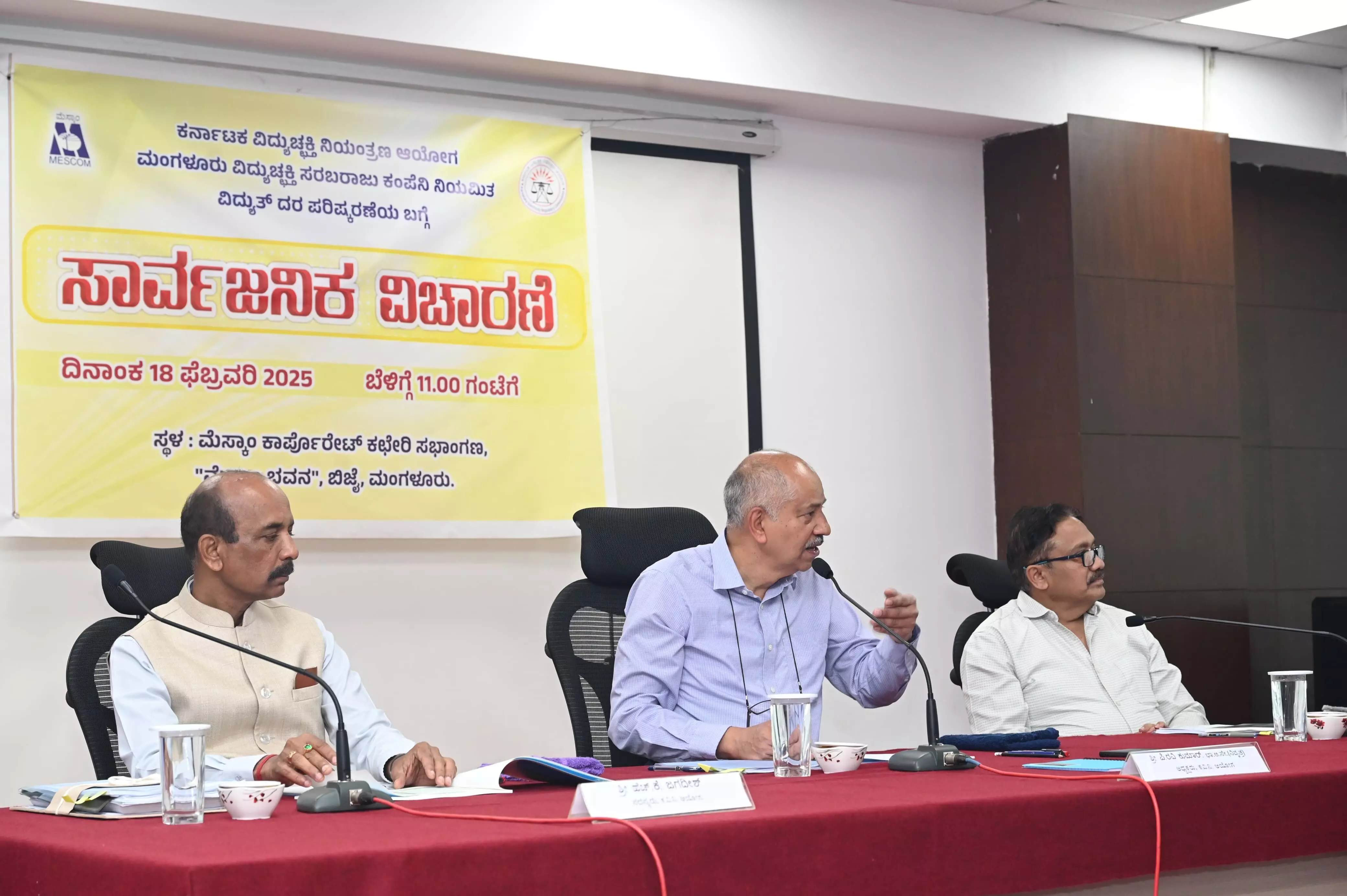 ಮಂಗಳೂರಿನ ಮೆಸ್ಕಾಂ ಪ್ರಧಾನ ಕಚೇರಿ ಸಭಾಂಗಣದಲ್ಲಿ ಮಂಗಳವಾರ ಕೆಇಆರ್ಸಿ ಅಧ್ಯಕ್ಷ ಪಿ. ರವಿ ಕುಮಾರ್ ಅಧ್ಯಕ್ಷತೆಯಲ್ಲಿ ನಡೆದ ವಿದ್ಯುತ್ ದರ ಪರಿಷ್ಕರಣೆ ಕುರಿತ ಸಾರ್ವಜನಿಕ ವಿಚಾರಣೆ ವೇಳೆ ತೀರ್ಥಹಳ್ಳಿ ಶಾಸಕ ಅರಗ ಜ್ಞಾನೇಂದ್ರ ಸೇರಿದಂತೆ ಗ್ರಾಹಕರು ದರ ಏರಿಕೆಯನ್ನು ವಿರೋಧಿಸಿದರು.