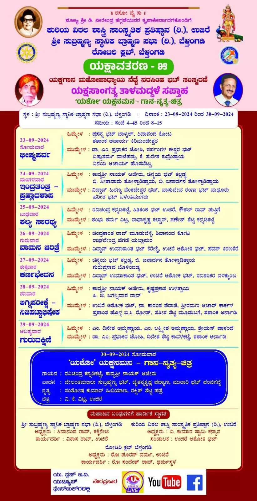 ಸೆಪ್ಟೆಂಬರ್ 23 ‘ಭೀಷ್ಮ ಪರ್ವ’, ಸೆಪ್ಟೆಂಬರ್ 24 ‘ಇಂದ್ರತಂತ್ರ - ಪ್ರಹ್ಲಾದಶಾಪ’, ಸೆಪ್ಟೆಂಬರ್ 25 ‘ಶಲ್ಯ ಸಾರಥ್ಯ’, ಸೆಪ್ಟೆಂಬರ್ 26 ‘ವಾಮನ ಚರಿತ್ರೆ’, ಸೆಪ್ಟೆಂಬರ್ 27 ‘ಕರ್ಣಭೇದನ’, ಸೆಪ್ಟೆಂಬರ್ 28 ‘ಅಗ್ನಿಪರೀಕ್ಷೆ - ನಿಜಪಟ್ಟಾಭಿಷೇಕ’, ಸೆಪ್ಟೆಂಬರ್ 29 ‘ಗುರುದಕ್ಷಿಣೆ’, ಸೆಪ್ಟೆಂಬರ್ 30 ‘ಯಶೋ’ ಯಕ್ಷನಮನ - ಗಾನ-ನೃತ್ಯ-ಚಿತ್ರ ಕಾರ್ಯಕ್ರಮ ಆಯೋಜಿಸಲಾಗಿದೆ.