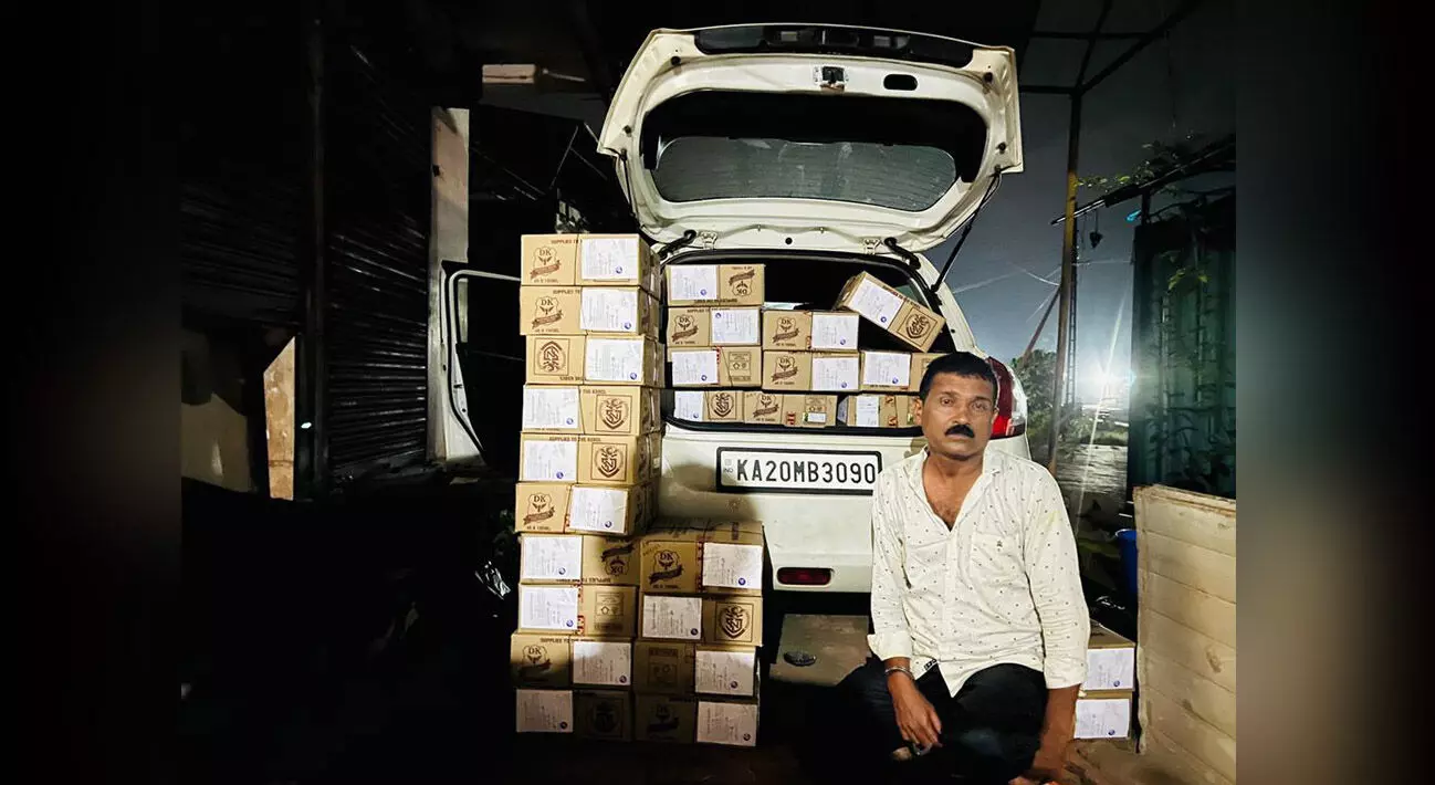 ಮಂಜೇಶ್ವರ ಚೆಕ್ ಪೋಸ್ಟ್ ನಲ್ಲಿ ತಪಾಸಣೆ ನಡೆಸುತ್ತಿದ್ದಾಗ ಈ ದಾರಿಯಾಗಿ ಬಂದ ಕಾರನ್ನು ತಡೆದು ಪರಿಶೀಲಿಸಿದಾಗ ಬಾಕ್ಸ್ ಗಳಲ್ಲಿ ತುಂಬಿಸಿದ್ದ ಸುಮಾರು 2400 ಪ್ಯಾಕೆಟ್ ಮದ್ಯವನ್ನು ವಶಪಡಿಸಿಕೊಳ್ಳಲಾಗಿದೆ. ಈತ ಕುಂಬಳೆ ಕಡೆಗೆ ಮದ್ಯ ಸಾಗಾಟ ಮಾಡುತ್ತಿದ್ದ ಎನ್ನಲಾಗಿದೆ.
