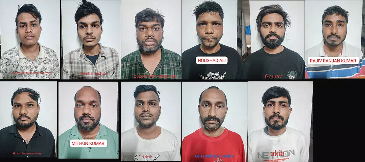 ಬಂಧಿತರನ್ನು ಗುಜರಾತ್ನ ಮಕವನ್ ವಿಕ್ರಂ (25), ಪಶ್ಚಿಮ ಬಂಗಾಳದ ಸೌಮ್ಯಾಧಿತ್ಯ ಚಟ್ಟೋಪಾಧ್ಯಾಯ (21), ಜಾರ್ಖಂಡ್ನ ಪುಪ್ಲ ಶಿವಕುಮಾರ್ ರಾವ್ (32) ಮತ್ತು ರಾಜೇಶ್ ಮಂಡನ್ (30), ಮಿಥುನ್ ಕುಮಾರ್ ಮಂಗರಾಜ್ (38), ಉತ್ತರ ಪ್ರದೇಶದ ಗೌರವ್ ಪಾಂಡೆ (24) ಮತ್ತು ಹರ್ಷ ಮಿಸ್ರಾ (22) ಹಾಗೂ ಮುಹಮ್ಮದ್ ಆಕೀಬ್ ಅಲಿ (27), ನೌಶಾದ್ ಅಲಿ (34), ಬಿಹಾರ್ನ ರಾಜೀವ್ ರಂಜನ್ ಕುಮಾರ್ (30), ರಾಜಸ್ತಾನದ ಓಂ ಪ್ರಕಾಶ್ ಯಾದವ್ (37) ಎಂದು ಗುರುತಿಸಲಾಗಿದೆ.