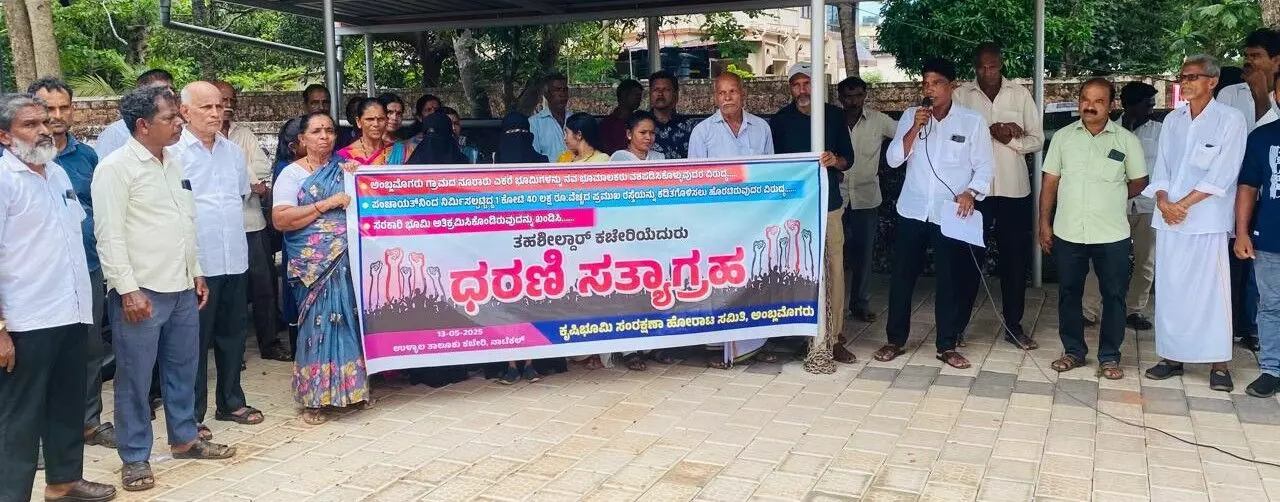 ಅಂಬ್ಲಮೊಗರು: ಗ್ರಾಮದ ನೂರಾರು ಎಕರೆ ಭೂಮಿಗಳನ್ನು ನವಭೂಮಾಲಕರು ವಶಪಡಿಸಿಕೊಳ್ಳುವುದರ ವಿರುದ್ಧ, ಪಂಚಾಯತ್ ನಿಂದ ನಿರ್ಮಿಸಲ್ಪಟ್ಟಿದ್ದ 1 ಕೋಟಿ 40 ಲಕ್ಷ ರೂ.ವೆಚ್ಚದ ಪ್ರಮುಖ ರಸ್ತೆಯನ್ನು ಕಡಿತ ಮಾಡಿರುವುದರ ವಿರುದ್ಧ ಹಾಗೂ ಸರಕಾರಿ ಭೂಮಿಗಳನ್ನು ಅತಿಕ್ರಮಿಸಿಕೊಂಡಿರುವುದನ್ನು ಖಂಡಿಸಿ ಅಂಬ್ಲಮೊಗರು ಗ್ರಾಮದ ಕ್ರಷಿಭೂಮಿ ಸಂರಕ್ಷಣಾ ಹೋರಾಟ ಸಮಿತಿ ನೇತೃತ್ವದಲ್ಲಿ ನಾಟೆಕಲ್ ನಲ್ಲಿರುವ ಉಳ್ಳಾಲ ತಾಲೂಕು ಕಚೇರಿಯೆದುರು ಇಂದು ಧರಣಿ ಸತ್ಯಾಗ್ರಹವನ್ನು ನಡೆಸಲಾಯಿತು.
