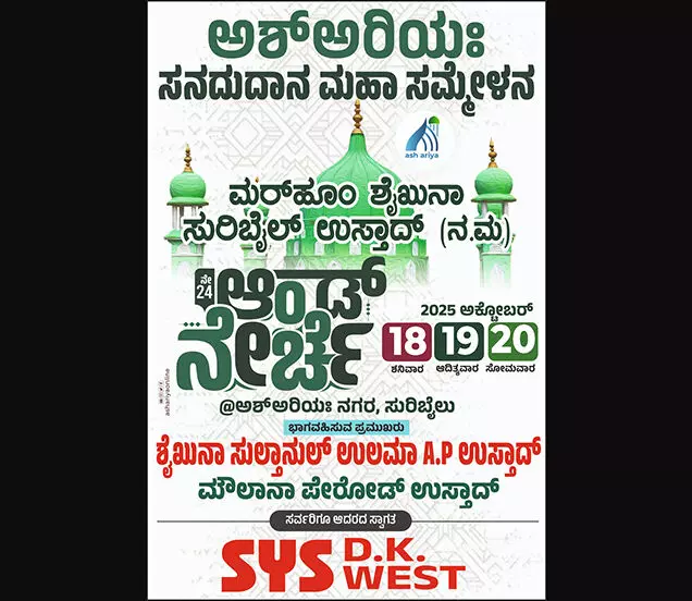 ಮಂಗಳೂರು: ದಾರುಲ್ ಅಶ್ಅರಿಯ್ಯಾ ಸನದುದಾನ ಸಮ್ಮೇಳನ ಹಾಗೂ ಸುರಿಬೈಲು ಉಸ್ತಾದ್ 24ನೇ ಆಂಡ್ ನೇರ್ಚೆಯು ಅ. 18, 19, 20ರಂದು ಸುರಿಬೈಲ್ ನಲ್ಲಿ ನಡೆಯಲಿದೆ.