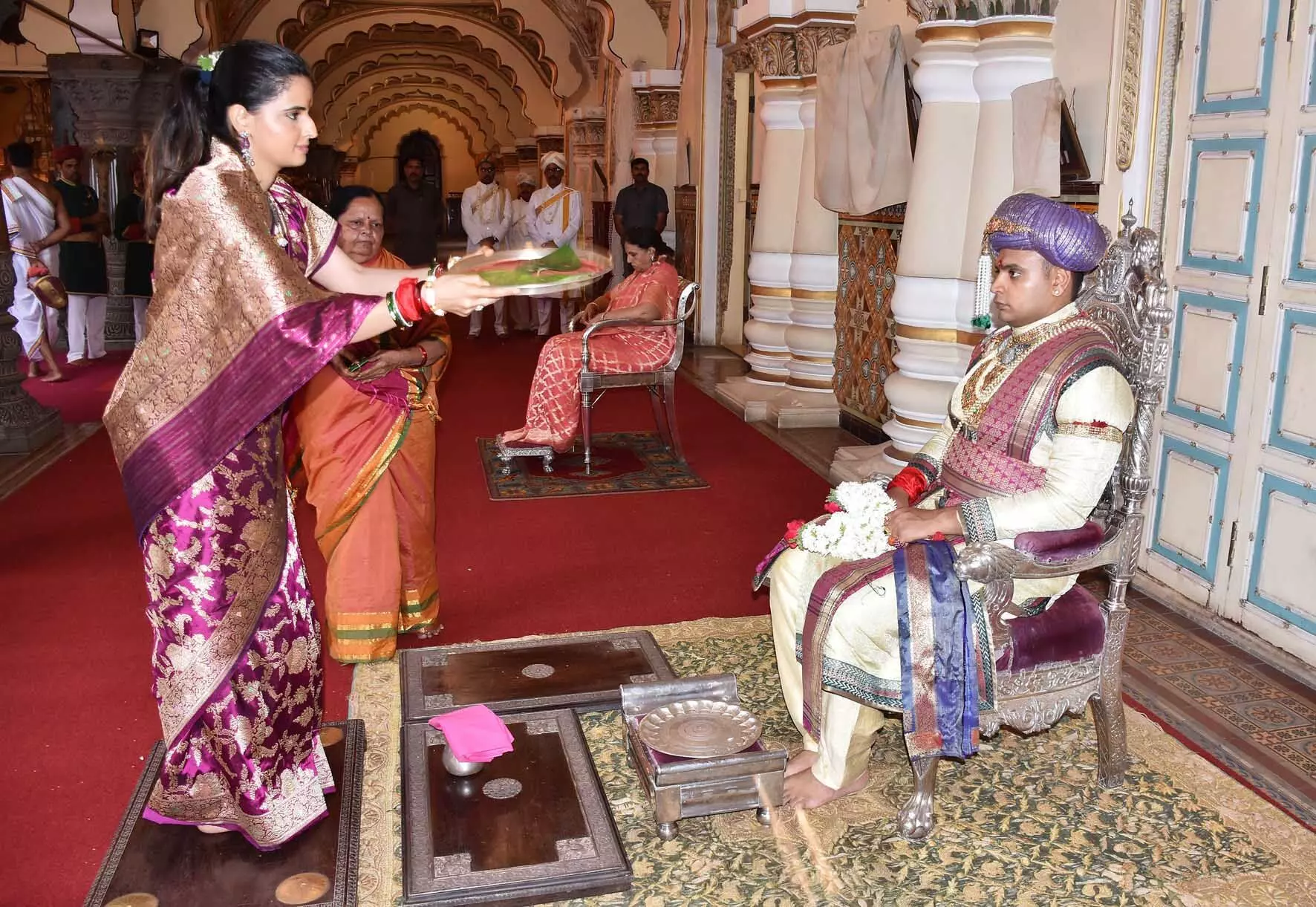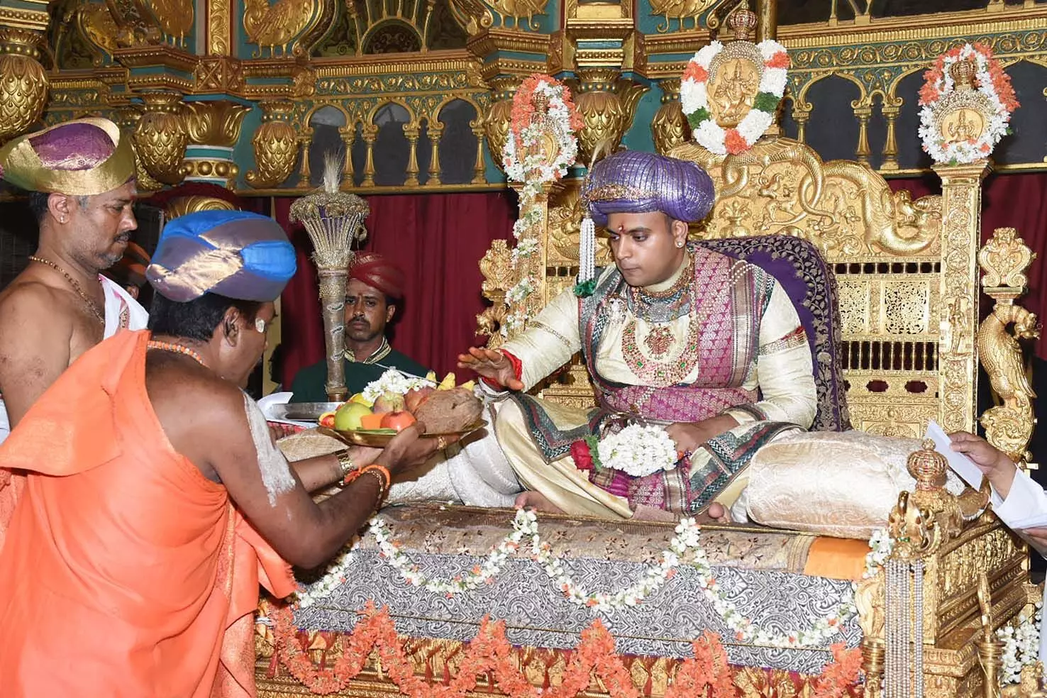 ಮೈಸೂರು ಅರಮನೆಯಲ್ಲಿ ಎಂಟನೇ ಬಾರಿಗೆ ಖಾಸಗಿ ದರ್ಬಾರ್‌ ನಡೆಸುತ್ತಿರುವ ರಾಜವಂಶಸ್ಥ ಯದುವೀರ್‌ ಕೃಷ್ಣದತ್ತ ಚಾಮರಾಜ ಒಡೆಯರ್‌ ಅವರು ಪೂಜೆಗಳಲ್ಲಿ ರವಿವಾರ ಬಳಿಗ್ಗೆ ಭಾಗಿಯಾದರು.