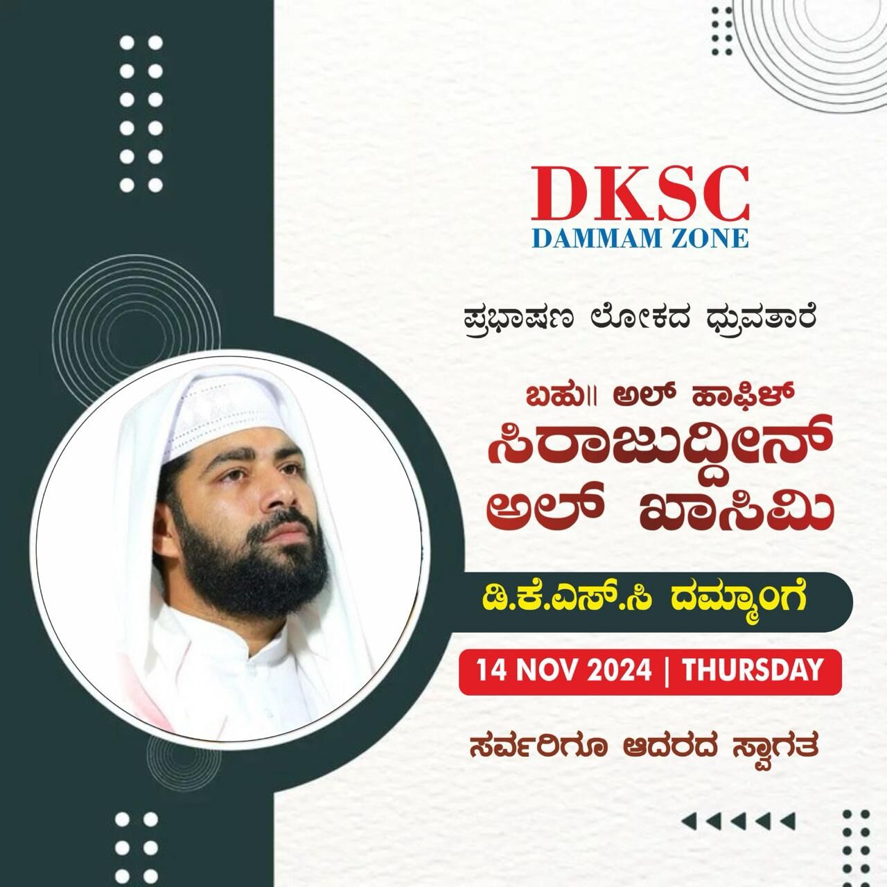 ದಮ್ಮಾಮ್ : ದಕ್ಷಿಣ ಕರ್ನಾಟಕ ಸುನ್ನಿ ಸೆಂಟರ್ (ರಿ) ಮಂಗಳೂರು ಇದರ 30 ನೇ ಸಂಸ್ಥಾಪನಾ ವರ್ಷದ ಅಂಗವಾಗಿ, ಡಿಕೆಎಸ್ಸಿ ದಮ್ಮಾಮ್ ವಲಯದ ಅಧೀನದಲ್ಲಿ ಬೃಹತ್ ಕುಟುಂಬ ಸಮ್ಮಿಲನ ಕಾರ್ಯಕ್ರಮ ನವೆಂಬರ್ 14 ರಂದು ಗುರುವಾರ ದಮ್ಮಾಮ್ ನಲ್ಲಿ ನಡೆಯಲಿದೆ.