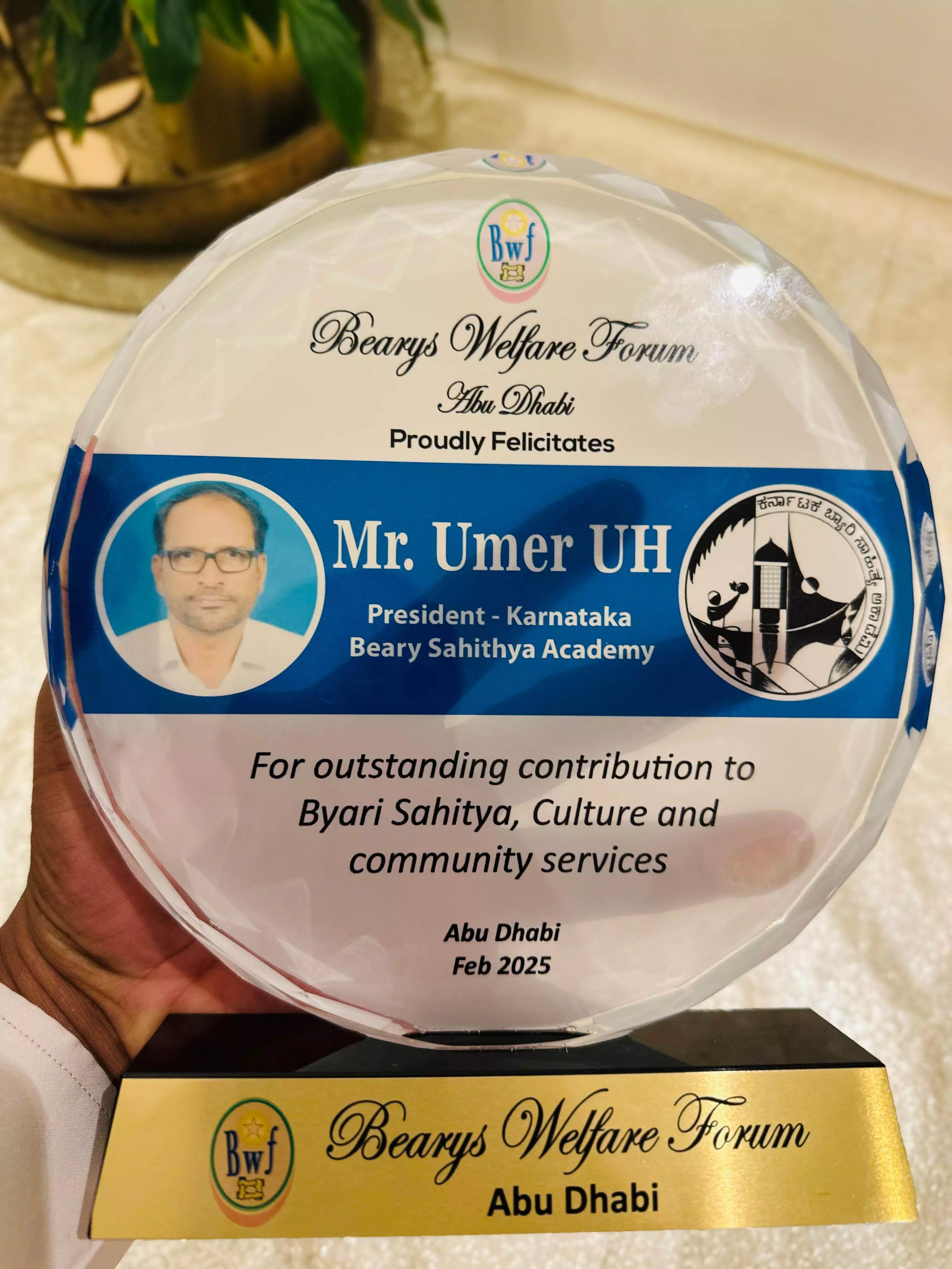 ಅಬುಧಾಬಿ| ಕರ್ನಾಟಕ ಬ್ಯಾರಿ ಸಾಹಿತ್ಯ ಅಕಾಡೆಮಿ ಅಧ್ಯಕ್ಷ ಉಮರ್ ಯು.ಎಚ್ ರಿಗೆ ಬಿಡಬ್ಲ್ಯೂಎಫ್ ವತಿಯಿಂದ ಸನ್ಮಾನ