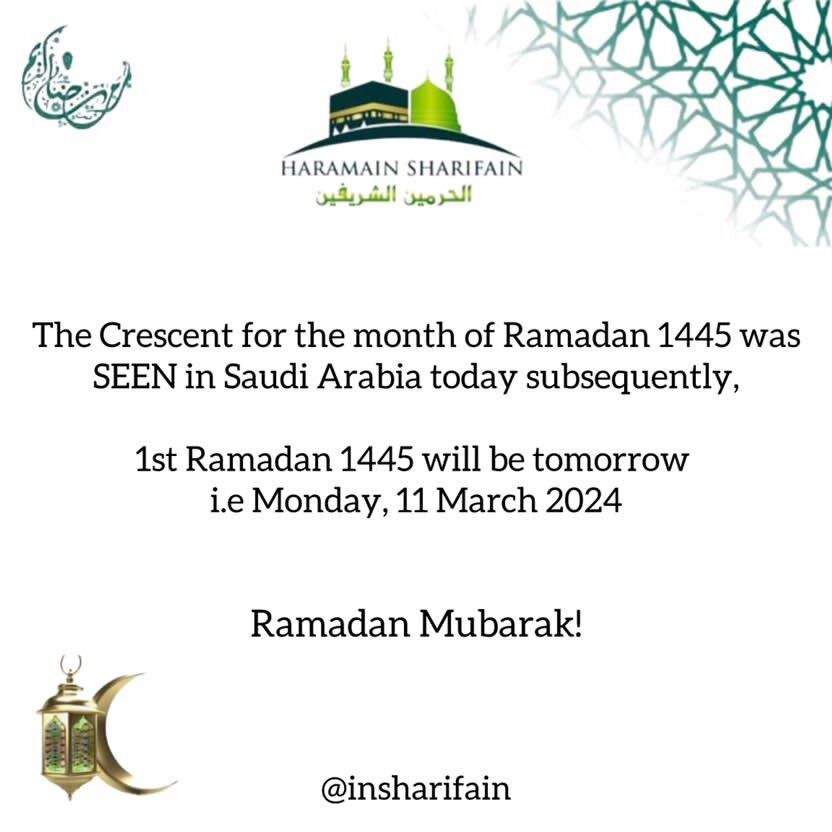 ರವಿವಾರ ಅಸ್ತಮಿಸಿದ ಸೋಮವಾರ ರಾತ್ರಿ ಇಶಾ ನಮಾಝಿನ ನಂತರ ಸೌದಿ ಅರೇಬಿಯಾದ ಮಸೀದಿಗಳಲ್ಲಿ ತರಾವೀಹ್ ಪ್ರಾರ್ಥನೆಗಳು ಪ್ರಾರಂಭವಾಗಲಿದೆ.