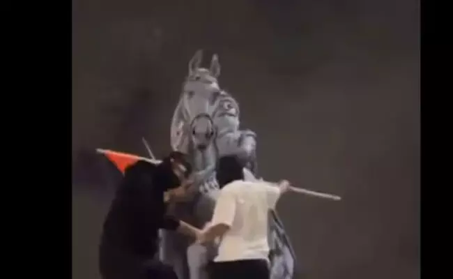 ಶನಿವಾರ ಒಂಟಾರಿಯೋದಲ್ಲಿ ನಡೆದ ಪ್ರತಿಭಟನೆ ಸಂದರ್ಭ ಫೆಲೆಸ್ತೀನ್ ಧ್ವಜ ಹಿಡಿದಿದ್ದ, ಮಾಸ್ಕ್ ಧರಿಸಿದ್ದ ಪ್ರತಿಭಟನಾಕಾರರು ಮಹಾರಾಜಾ ರಂಜಿತ್ ಸಿಂಗ್ ಅವರ ಪ್ರತಿಮೆ ಸ್ಥಾಪಿಸಿದ್ದ ಪೀಠದ ಮೇಲೇರಿ, ರಂಜಿತ್ ಸಿಂಗ್ ಅವರ ಕುದುರೆಯ ಕುತ್ತಿಗೆಗೆ ಫೆಲೆಸ್ತೀನ್ ದೇಶದ ಸಾಂಪ್ರದಾಯಕ ಸ್ಕಾರ್ಫ್ ಅನ್ನು ಹೊದಿಸಿದ್ದಾರೆ. ಮತ್ತೊಬ್ಬ ವ್ಯಕ್ತಿ ಈ ಘಟನೆಯನ್ನು ಚಿತ್ರೀಕರಿಸುತ್ತಿರುವುದಾಗಿ ತೋರಿಸುವ ವೀಡಿಯೊ ಸಾಮಾಜಿಕ ಮಾಧ್ಯಮದಲ್ಲಿ ವೈರಲ್ ಆಗಿದೆ.