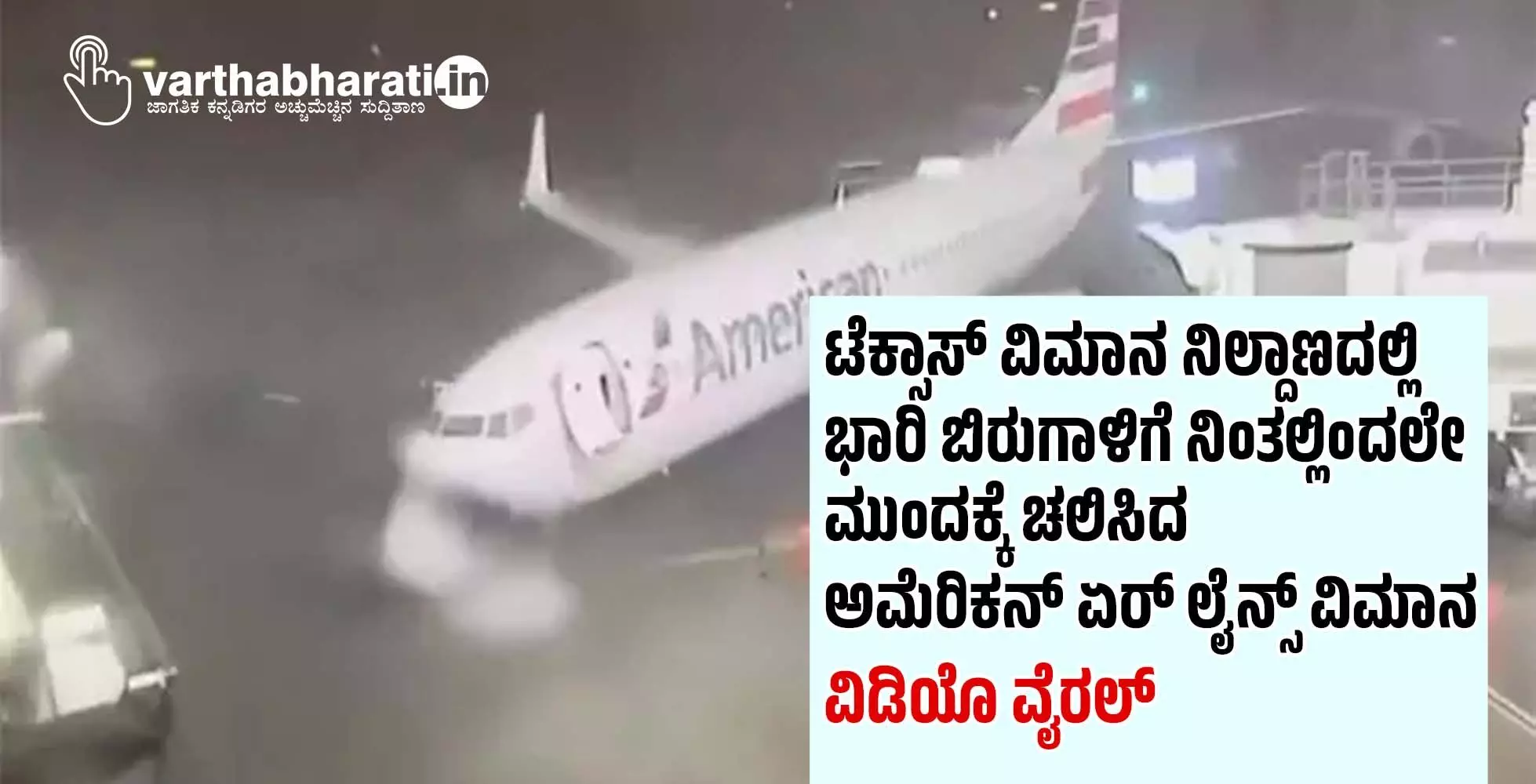 ಟೆಕ್ಸಾಸ್ ವಿಮಾನ ನಿಲ್ದಾಣದಲ್ಲಿ ಭಾರಿ ಬಿರುಗಾಳಿಗೆ ನಿಂತಲ್ಲಿಂದಲೇ ಮುಂದಕ್ಕೆ ಚಲಿಸಿದ ಅಮೆರಿಕನ್ ಏರ್ ಲೈನ್ಸ್ ವಿಮಾನ ; ವಿಡಿಯೊ ವೈರಲ್
