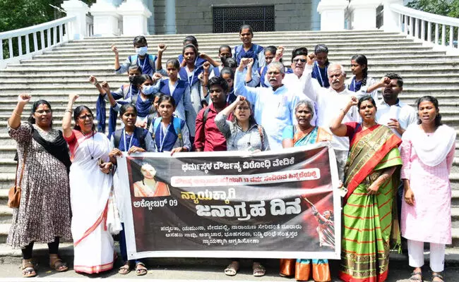 ಕಲಬುರಗಿ: ಅತ್ಯಾಚಾರವಾಗಿ ಕೊಲೆಯಾಗಿರುವ 17 ವರ್ಷದ ಸೌಜನ್ಯ ಸೇರಿದಂತೆ ಧರ್ಮಸ್ಥಳದಲ್ಲಿ ಆಗಿರುವಂತಹ ಅನೇಕ ಅಸಹಜ ಸಾವುಗಳ ಬಗ್ಗೆ ಸೂಕ್ತ ತನಿಖೆ ನಡೆಸಿ ನೈಜ ಆರೋಪಿಗಳನ್ನು ಪತ್ತೆ ಹಚ್ಚಬೇಕೆಂದು ಆಗ್ರಹಿಸಿ ಧರ್ಮಸ್ಥಳ ದೌರ್ಜನ್ಯ ವಿರೋಧಿ ವೇದಿಕೆ ವತಿಯಿಂದ ಜಿಲ್ಲಾಧಿಕಾರಿಗಳ ಕಚೇರಿ ಎದುರು ಪ್ರತಿಭಟಿಸಿ, ಮುಖ್ಯಮಂತ್ರಿಗಳಿಗೆ ಮನವಿ ಸಲ್ಲಿಸಲಾಯಿತು.