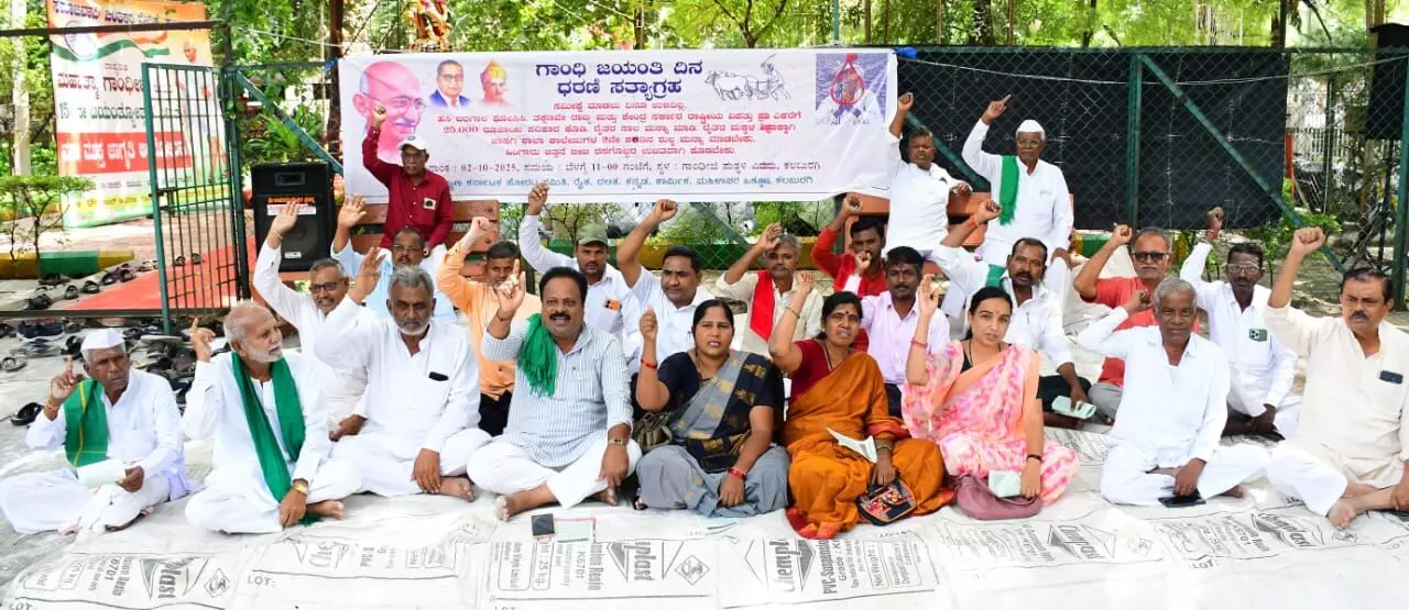 ಕಲಬುರಗಿ : ಅತಿವೃಷ್ಟಿಯಿಂದ ಹಾನಿಗೀಡಾದ ಕಲಬುರಗಿ ಜಿಲ್ಲೆಯನ್ನು ಹಸಿ ಬರಗಾಲ ಎಂದು ಘೋಷಣೆ ಮಾಡುವುದು ಸೇರಿದಂತೆ ಇತರೆ ಬೇಡಿಕೆಗಳನ್ನು ಈಡೇರಿಸಬೇಕೆಂದು ಒತ್ತಾಯಿಸಿ, ಕಲ್ಯಾಣ ಕರ್ನಾಟಕ ಹೋರಾಟ ಸಮಿತಿ ಕಲಬುರಗಿ ಆಶ್ರಯದಲ್ಲಿ ರೈತ, ದಲಿತ, ಕನ್ನಡ, ಕಾರ್ಮಿಕ, ಮಹಿಳಾ ಸಂಘಟನೆಗಳ ಬೆಂಬಲದೊಂದಿಗೆ ಅನಿರ್ಧಿಷ್ಟಾವಧಿ ಧರಣಿ ಸತ್ಯಾಗ್ರಹ ಆರಂಭಿಸಲಾಯಿತು.