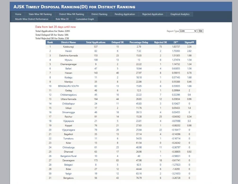 ಇನ್ನು ಜಿಲ್ಲಾವಾರು ಅರ್ಜಿ ವಿಲೇವಾರಿ ಪಟ್ಟಿ ವೀಕ್ಷಿಸಿದಾಗ ಅಗ್ರ ಮೂರು ಕ್ರಮಾಂಕಗಳು ಕಲಬುರಗಿ, ವಿಜಯನಗರ, ರಾಯಚೂರು ಸ್ಥಾನ ಪಡೆದುಕೊಂಡಿವೆ. ಉಳಿದಂತೆ 6ನೇ ಮತ್ತು 9ನೇ ಕ್ರಮಾಂಕದಲ್ಲಿ ಕ್ರಮವಾಗಿ ಯಾದಗಿರಿ ಮತ್ತು ಕೊಪ್ಪಳ ಜಿಲ್ಲೆ ಸ್ಥಾನ ಗಳಿಸಿದ್ದು, ಒಟ್ಟಾರೆಯಾಗಿ ಕಲ್ಯಾಣದ 5 ಜಿಲ್ಲೆಗಳು ಟಾಪ್ 10ನಲ್ಲಿ ಇರುವ ಮೂಲಕ ಸಾರ್ವಜನಿಕರಿಗೆ ಸೇವೆಗೆ ತ್ವರಿತವಾಗಿ ಸ್ಪಂದಿಸಲಾಗುತ್ತಿದೆ.