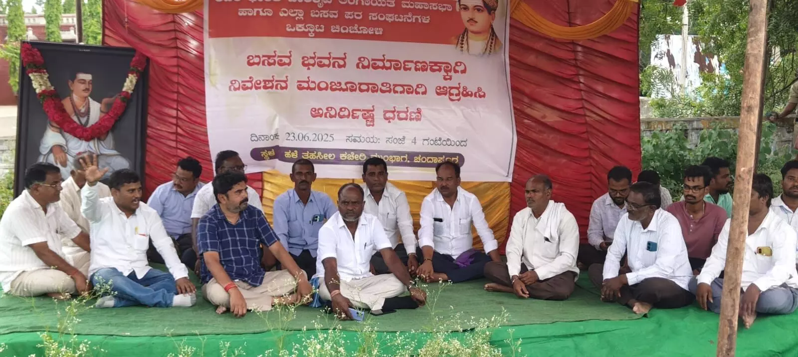 ನಾಮಫಲಕ ತೆರವುಗೊಳಿಸಿದಕ್ಕಾಗಿ ಅಖಿಲ ಭಾರತ ವೀರಶೈವ ಲಿಂಗಾಯತ ಮಹಾಸಭಾ ಹಾಗೂ ಎಲ್ಲಾ ಬಸವಪರ ಸಂಘಟನೆಗಳ ಒಕ್ಕೂಟದಿಂದ ಬಸವ ಭವನ ನಿರ್ಮಾಣಕ್ಕಾಗಿ ನಿವೇಶನ ಮಂಜೂರಾತಿ ಆಗ್ರಹಿಸಿ ಅನಿರ್ಧಿಷ್ಟಾ ಧರಣಿ ನಡೆಸುತ್ತಿದ್ದಾರೆ.