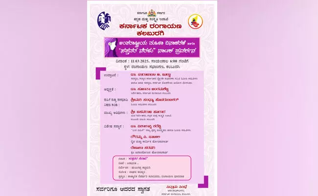 ಕಲಬುರಗಿ: ಕನ್ನಡ ಮತ್ತು ಸಂಸ್ಕೃತಿ ಇಲಾಖೆ ಹಾಗೂ ಕಲಬುರಗಿ ರಂಗಾಯಣ ಸಂಯುಕ್ತಾಶ್ರಯದಲ್ಲಿ ಇದೇ ಮಾ.11 ರಂದು ಸಂಜೆ 6 ಗಂಟೆಗೆ ರಂಗಾಯಣದ ಸಭಾಂಗಣದಲ್ಲಿ ಅಂತರಾಷ್ಟ್ರೀಯ ಮಹಿಳಾ ದಿನಾಚರಣೆ ಮತ್ತು ಸತ್ತವರ ನೆರಳು ನಾಟಕ ಪ್ರದರ್ಶನ ನಡೆಯಲಿದೆ.