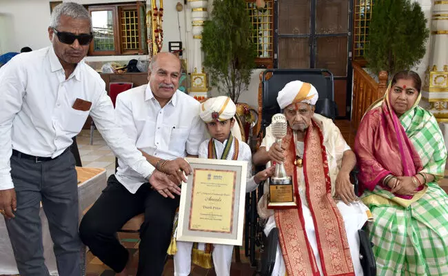 ಡಾ ಶಿವರಾಜ್ ಶಾಸ್ತ್ರಿ ಹೇರೂರ ಅವರು ಅಂತರವಾಣಿಗೆ ನೀಡಿದ ಪ್ರಶಸ್ತಿಯನ್ನು ಶರಣಬಸವೇಶ್ವರ ಸಂಸ್ಥಾನದ 8ನೇ ಮಹಾದಾಸೋಹ ಪೀಠಾಧಿಪತಿ ಡಾ.ಶರಣಬಸವಪ್ಪ ಅಪ್ಪಾಜಿ, ಶರಣಬಸವೇಶ್ವರ ವಿದ್ಯಾವರ್ಧಕ ಸಂಘದ ಚೇರಪರ್ಸನ್ ಮಾತೋಶ್ರೀ ಡಾ.ದಾಕ್ಷಾಯಿಣಿ ಅವ್ವಾಜಿ, ಶರಣಬಸವೇಶ್ವರ ಸಂಸ್ಥಾನದ 9ನೇ ಮಹಾದಾಸೋಹ ಪೀಠಾಧಿಪತಿ ಪೂಜ್ಯ ಚಿರಂಜೀವಿ ದೊಡ್ಡಪ್ಪ ಅಪ್ಪಾಜಿ ಹಾಗೂ ಸಂಘದ ಕಾರ್ಯದರ್ಶಿ ಶ್ರೀ ಬಸವರಾಜ ದೇಶಮುಖ ಅವರಿಗೆ ನೀಡಿ ಆಶೀರ್ವಾದ ಪಡೆದರು.