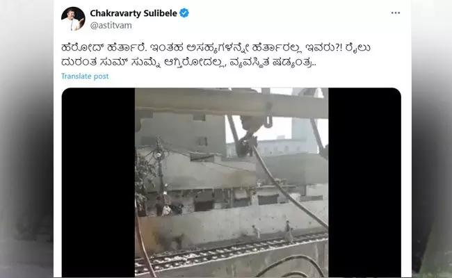 ಬೆಂಗಳೂರು : ಬಲಪಂಥೀಯ ವಾಗ್ಮಿ, ಸುಳ್ಳು ಸುದ್ದಿ ಹರಡುವ ಕುಖ್ಯಾತಿ ಇರುವ ಚಕ್ರವರ್ತಿ ಸೂಲಿಬೆಲೆ ಪಾಕಿಸ್ತಾನದ ಕರಾಚಿಯ ಹಳೇ ವಿಡಿಯೋ ಪೋಸ್ಟ್ ಮಾಡಿ ಭಾರತದ ರೈಲು ದುರಂತ ಹಿಂದಿನ ಷಡ್ಯಂತ್ರ ಎಂದು ಸುಳ್ಳು ಸುದ್ದಿ ಹರಡಿದ್ದಾರೆ.