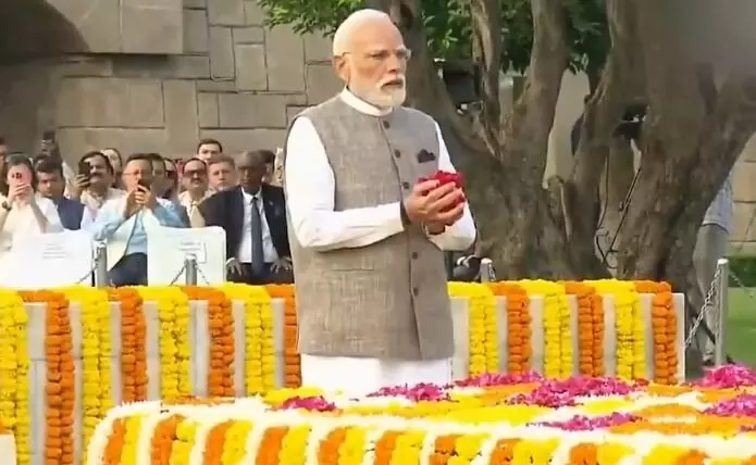 ಗಾಂಧಿ ಜಯಂತಿ : ರಾಜ್ ಘಾಟ್ನಲ್ಲಿ ಮಹಾತ್ಮ ಗಾಂಧಿ ಸ್ಮಾರಕಕ್ಕೆ ಪ್ರಧಾನಿ ಮೋದಿಯಿಂದ ಪುಷ್ಪನಮನ