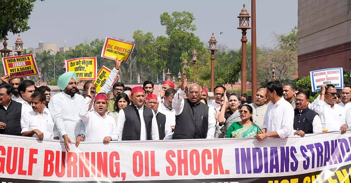 “ಕೊಲ್ಲಿ ಉರಿಯುತ್ತಿದೆ, ತೈಲ ಆಘಾತ ಎದುರಾಗಿದೆ. ಭಾರತೀಯರು ಅಲ್ಲಿ ಸಿಲುಕಿಕೊಂಡಿದ್ದಾರೆ. ಭಾರತಕ್ಕೆ ನಾಯಕತ್ವ ಬೇಕು—ಮೌನವಲ್ಲ” ಎಂದು ಬರೆದಿದ್ದ ದೊಡ್ಡ ಬ್ಯಾನರ್ ಹಿಡಿದು ಸಂಸದರು ಕೇಂದ್ರ ಸರ್ಕಾರ ಹಾಗೂ ಪ್ರಧಾನಿ ನರೇಂದ್ರ ಮೋದಿ ವಿರುದ್ಧ ಘೋಷಣೆಗಳನ್ನು ಕೂಗಿದರು.