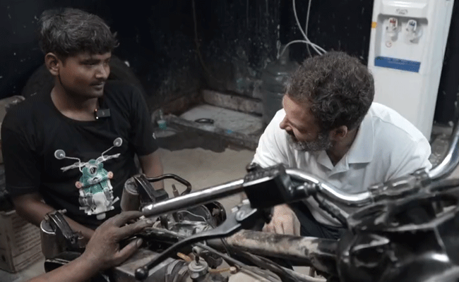 ಬೈಕ್ನ ಸರ್ವಿಸ್ ಮಾಡಿದ ರಾಹುಲ್ ಗಾಂಧಿ ಅಂಗಡಿಗಳಲ್ಲಿ ಕೆಲಸ ಮಾಡುವವರಿಗೆ ಸಂಬಂಧಿಸಿದ ಸಮಸ್ಯೆಗಳನ್ನು ಆಲಿಸಿದ್ದಾರೆ.