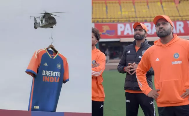 ಹೆಲಿಕಾಪ್ಟರೊಂದು ಟೀಮ್ ಇಂಡಿಯಾದ ನೂತನ ಟಿ20 ಜರ್ಸಿಯನ್ನು ಹೊತ್ತುಕೊಂಡು ಧರ್ಮಶಾಲಾ ಸ್ಟೇಡಿಯಮ್ನಲ್ಲಿ ಸುತ್ತು ಬರುವುದನ್ನು ಭಾರತೀಯ ಕ್ರಿಕೆಟ್ ತಂಡದ ನಾಯಕ ರೋಹಿತ್ ಶರ್ಮ, ಆಲ್ರೌಂಡರ್ ರವೀಂದ್ರ ಜಡೇಜ ಮತ್ತು ಎಡಗೈ ಸ್ಪಿನ್ನರ್ ಕುಲದೀಪ್ ಯಾದವ್ ನೋಡುತ್ತಿರುವುದನ್ನು ತೋರಿಸುವ ವೀಡಿಯೊವೊಂದನ್ನು ಅಡಿಡಸ್ ಸೋಮವಾರ ಇನ್ಸ್ಟಾಗ್ರಾಮ್ನಲ್ಲಿ ಹಾಕಿದೆ.